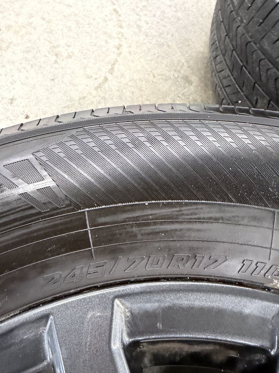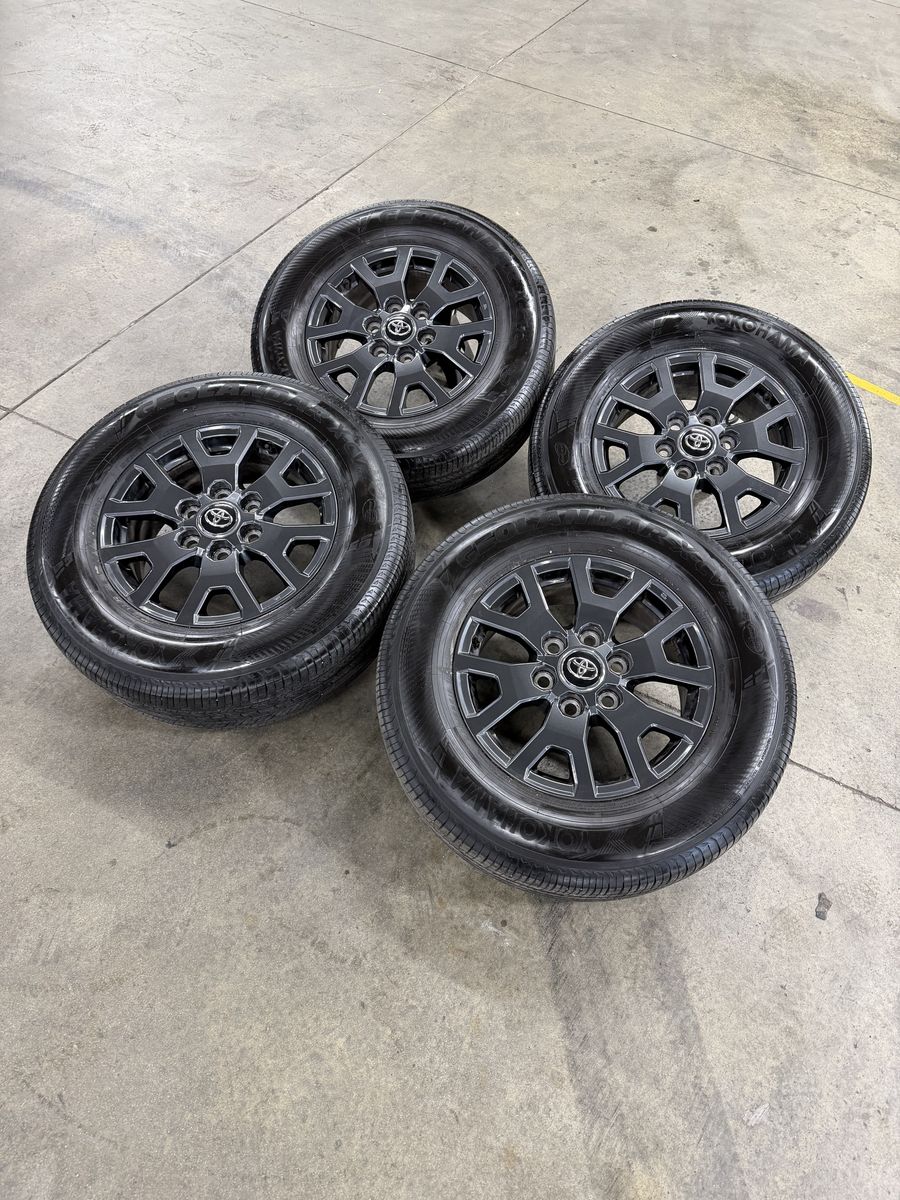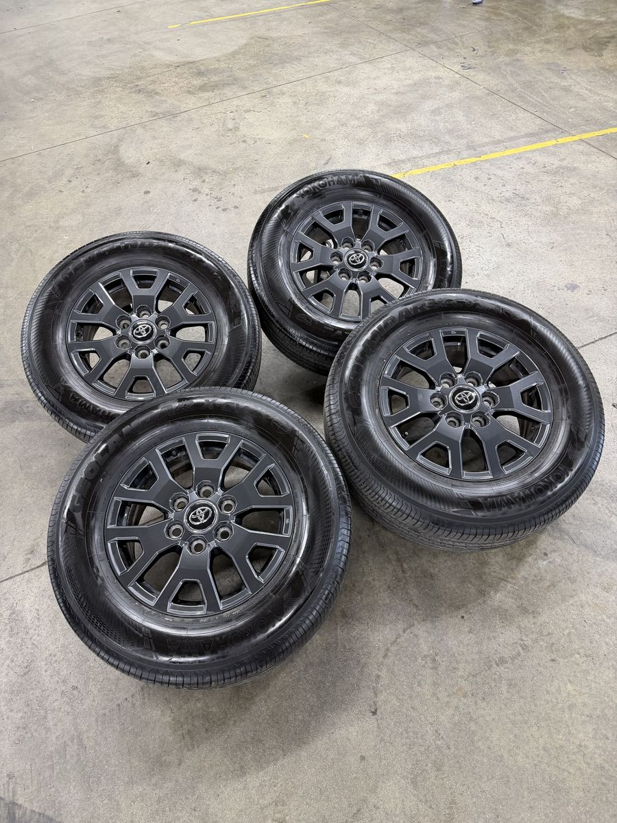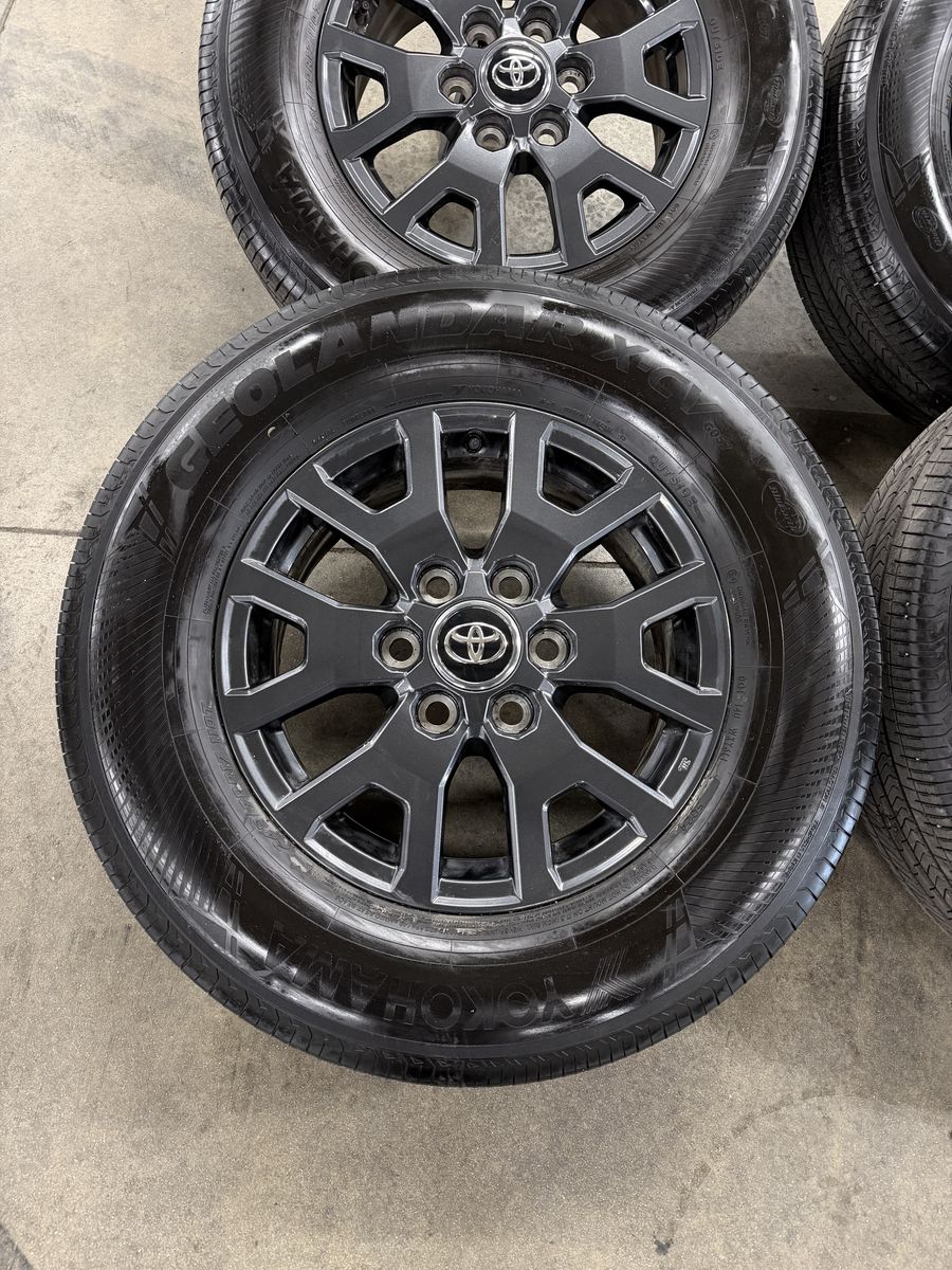 Wheels are 17in OEM wheels off a 2026 Toyota 4Runner. Wheels are in perfect shape no curb rash, dings or damage on them, all wheels are in like new shape. All of the center caps as well as TPMS are also included. Tires are 245/70/17 Yokohama geolander, at2, top of the line tires, no patches or plugs in them, tires have less then 2500 miles and in like new shape.