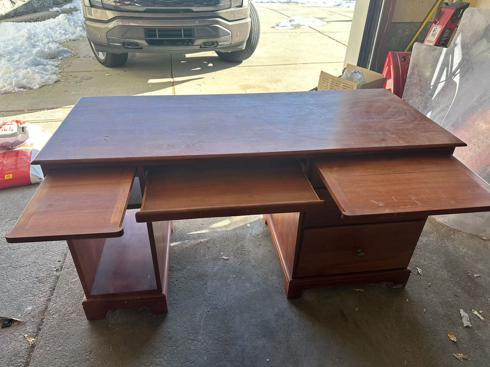 Fabulous real wood desk. Designed for older tower desktop. Top is scratched. Pick up in Emigration Canyon