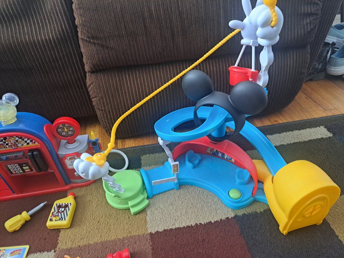 Disney Mickey Mouse track sets. 1 racing track and 1 Mickey Mouse Clubhouse track and house. Cute gas station and some random cars. These items come from a smoke free home. Please contact me by text.
