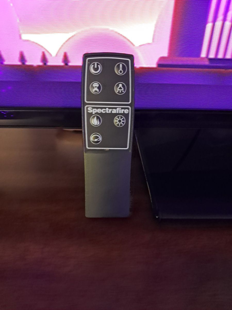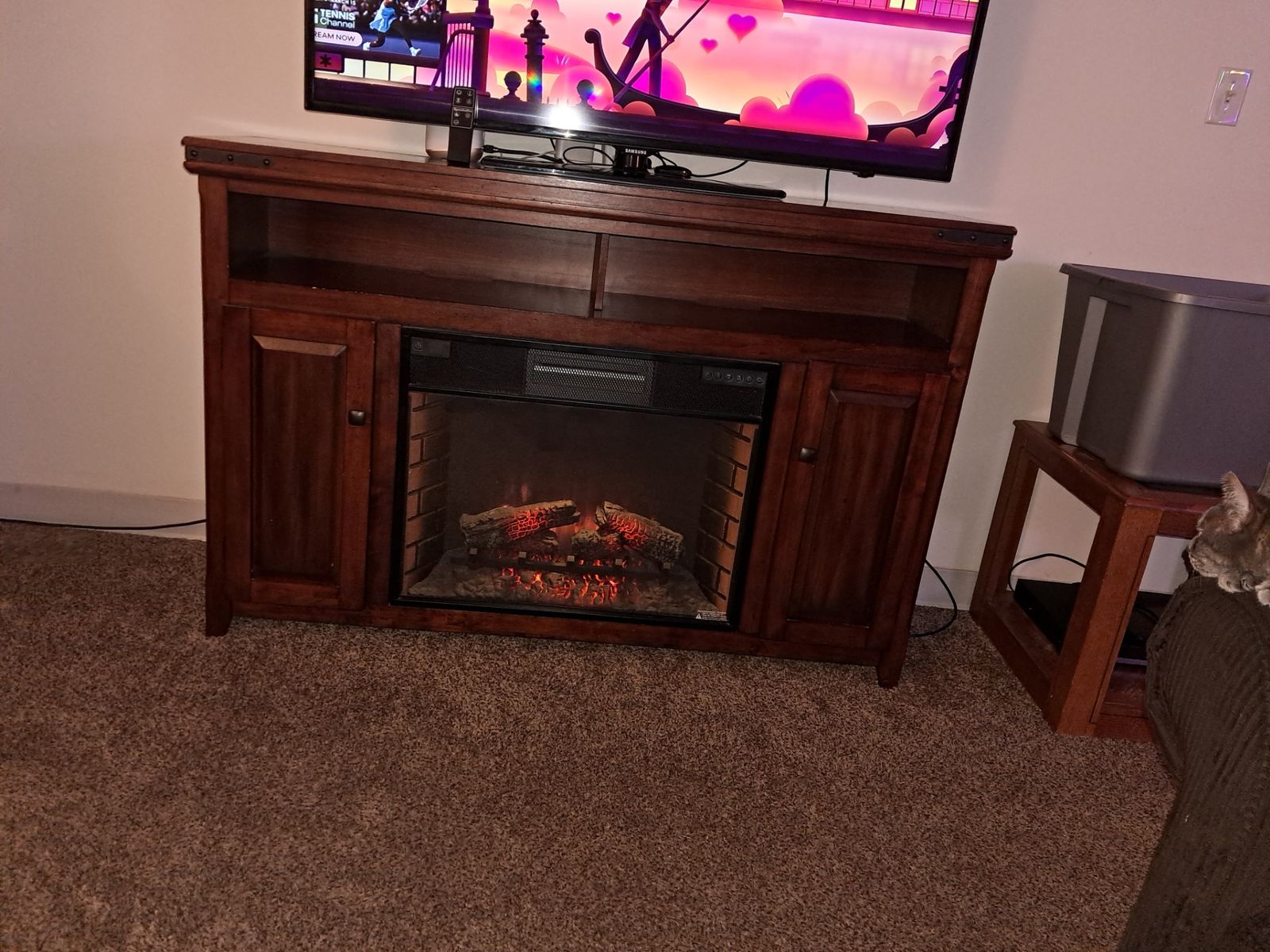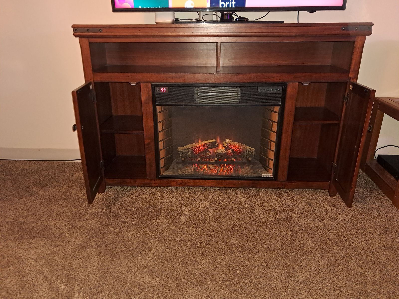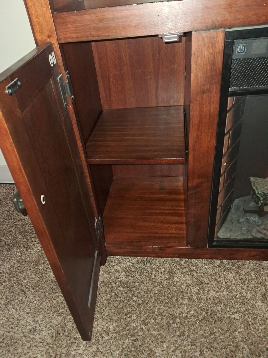Venmo38"X58"X15" Cherry wood , very sturdy TV stand with 5 speed control remote. 5 color options, 3 background settings, Heater with a timer shutoff. 4 shelves with doors, 2 outside selves. Bought from RC Willey. VERY HEAVY, must pick up.