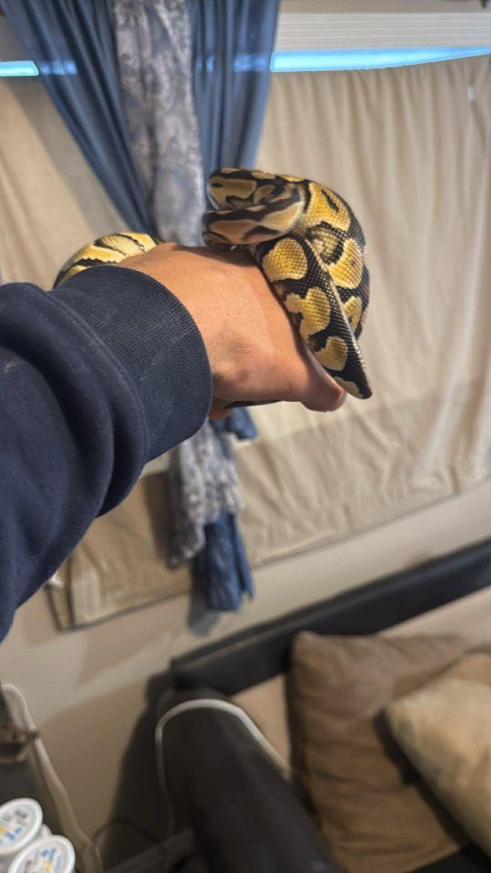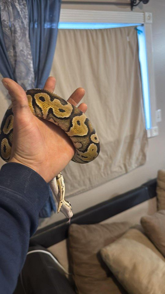 rehoming some animals so I can put more care and attention into the ones that need it more than other species. this is bumblebee, he is a great eater, and very calm, he's only shy when in the enclosure he's not strikey at all but scared and shy, great pet for kids to handle with close adult supervision. his dad is ten years old and pretty small even for an adult male ball python so statistically he shouldn't get huge.