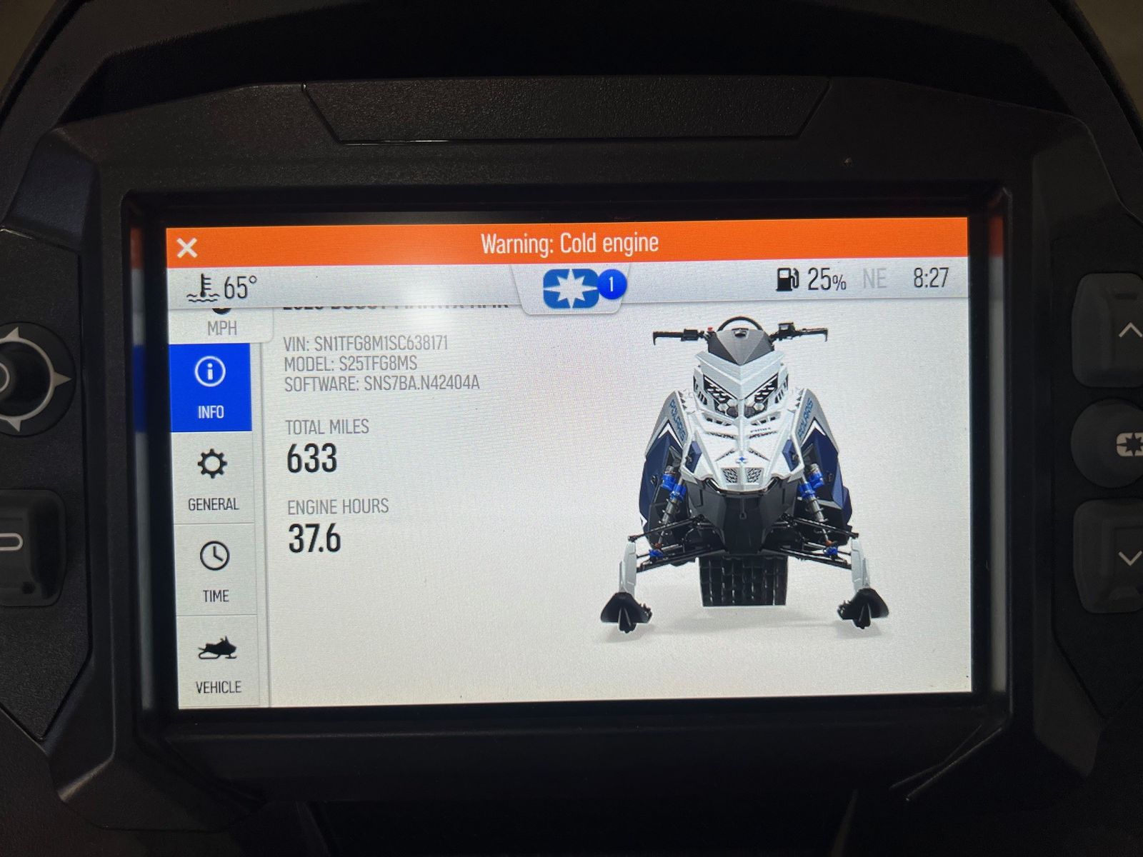The 2025 Polaris Patriot Boost RMK Khaos 155 7S 3.25 features a Liquid Cooled, Horizontal In-line, Reed Valve, 2 Stroke Engine with a displacement of 840cc. It is equipped with a Continuously Variable (CVT) Transmission and has an Independent A-Arm Front Suspension with 9.5 inches of travel. The rear suspension features 16 inches of travel with a Shock Mounted Adjustment. This snowmobile is equipped with rear Hydraulic Disc Brakes for enhanced safety and control. The RMK KHAOS 155 Boost is designed for mountain enthusiasts, offering a blend of performance and comfort for various riding conditions. This sled has 622 miles and is priced at $18,500.00 plus tax, licensing, and dealer fees. Stock #P38171-U, Dealer #0498. Available at Weller Rec; call 435-783-8360 for details.
