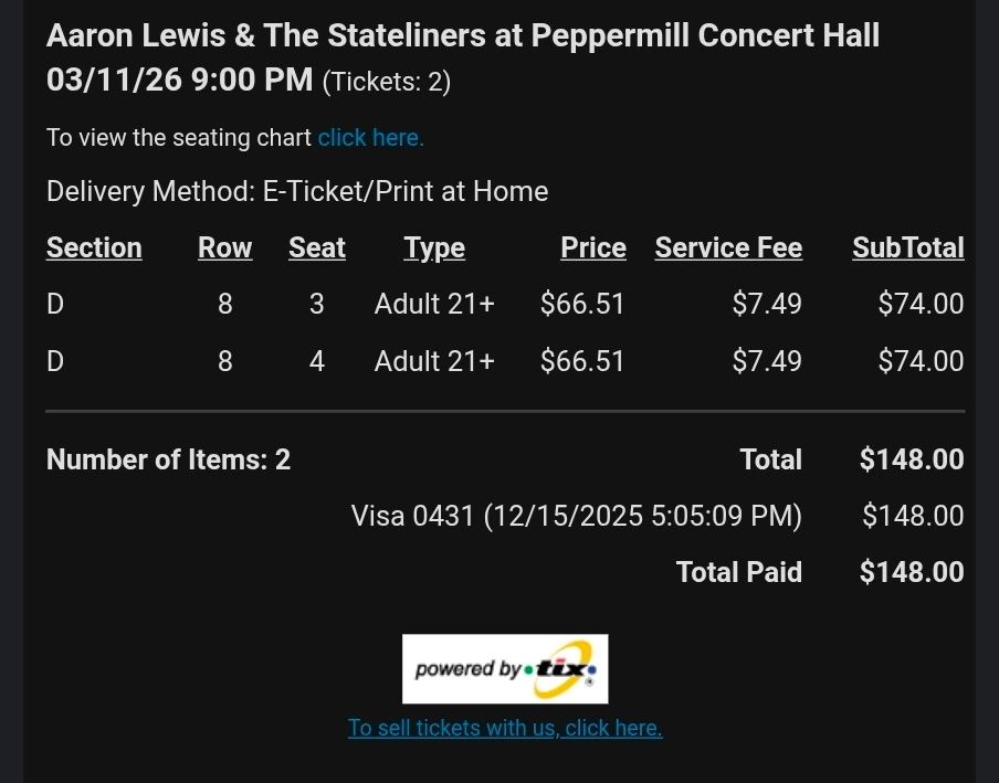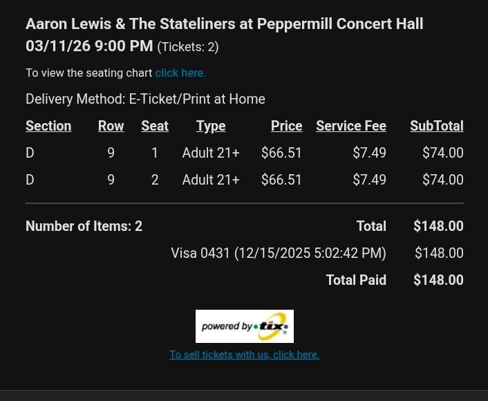 VenmoWe’ve had something come up and can’t attend this great concert. Two pairs of tickets available. Asking $148 per pair.