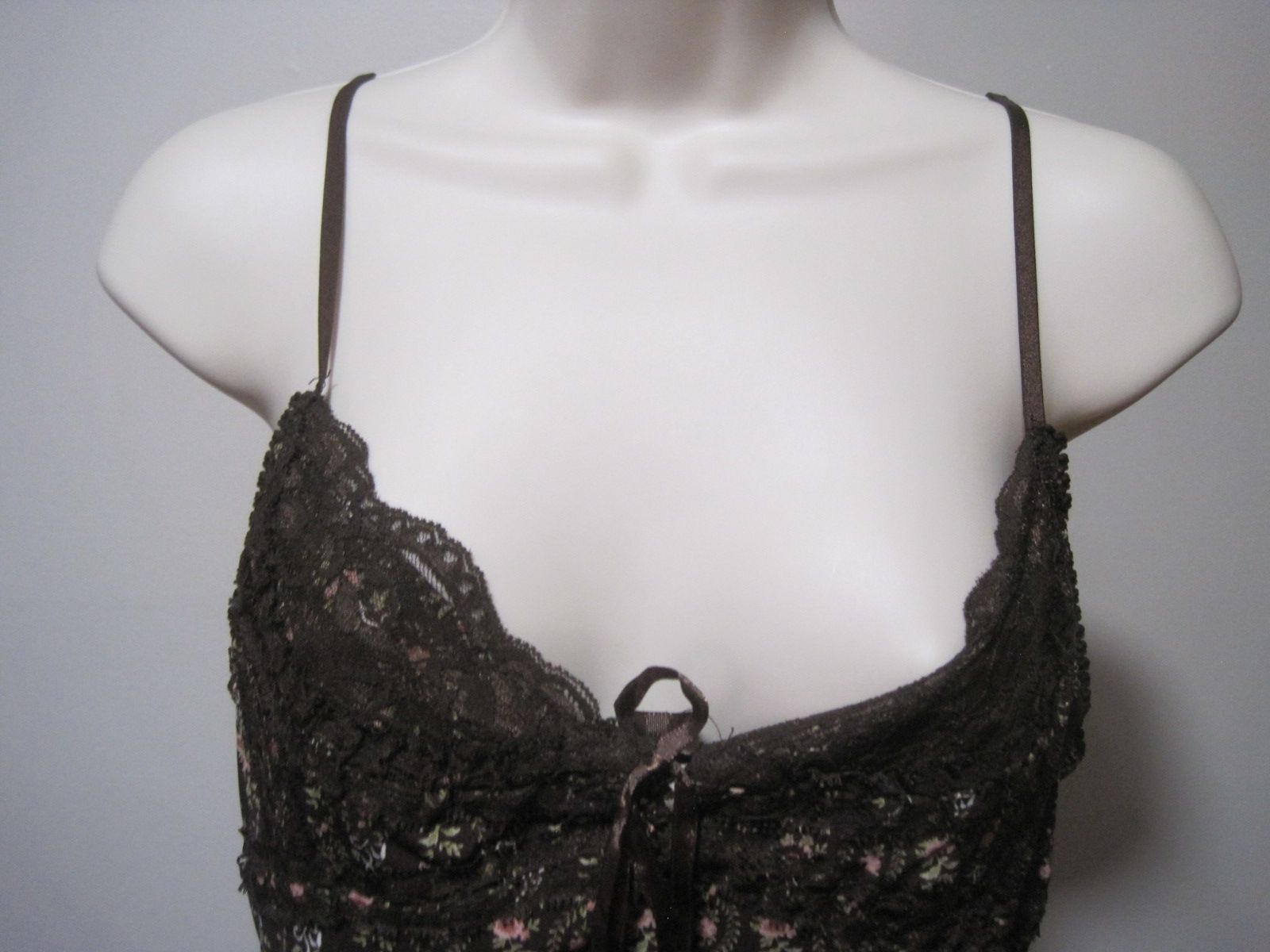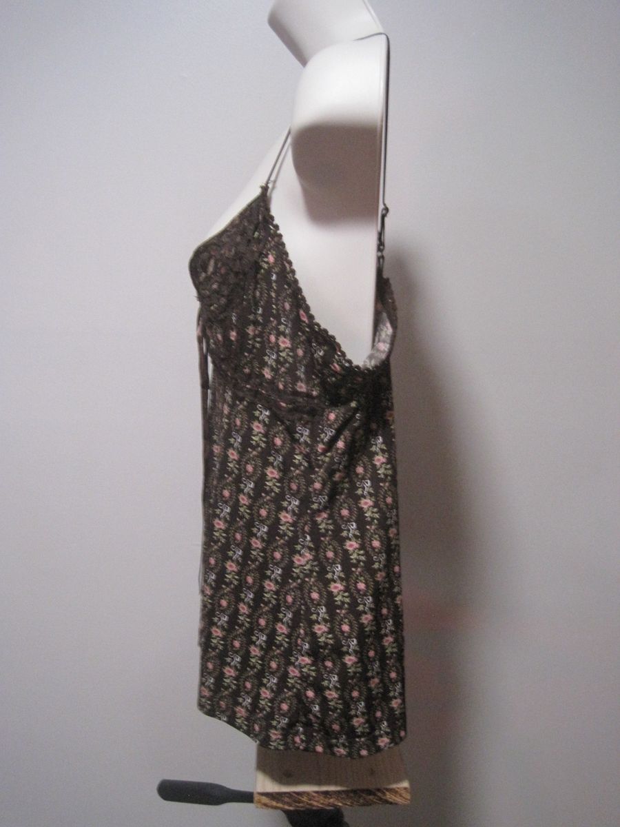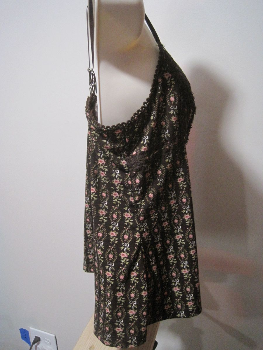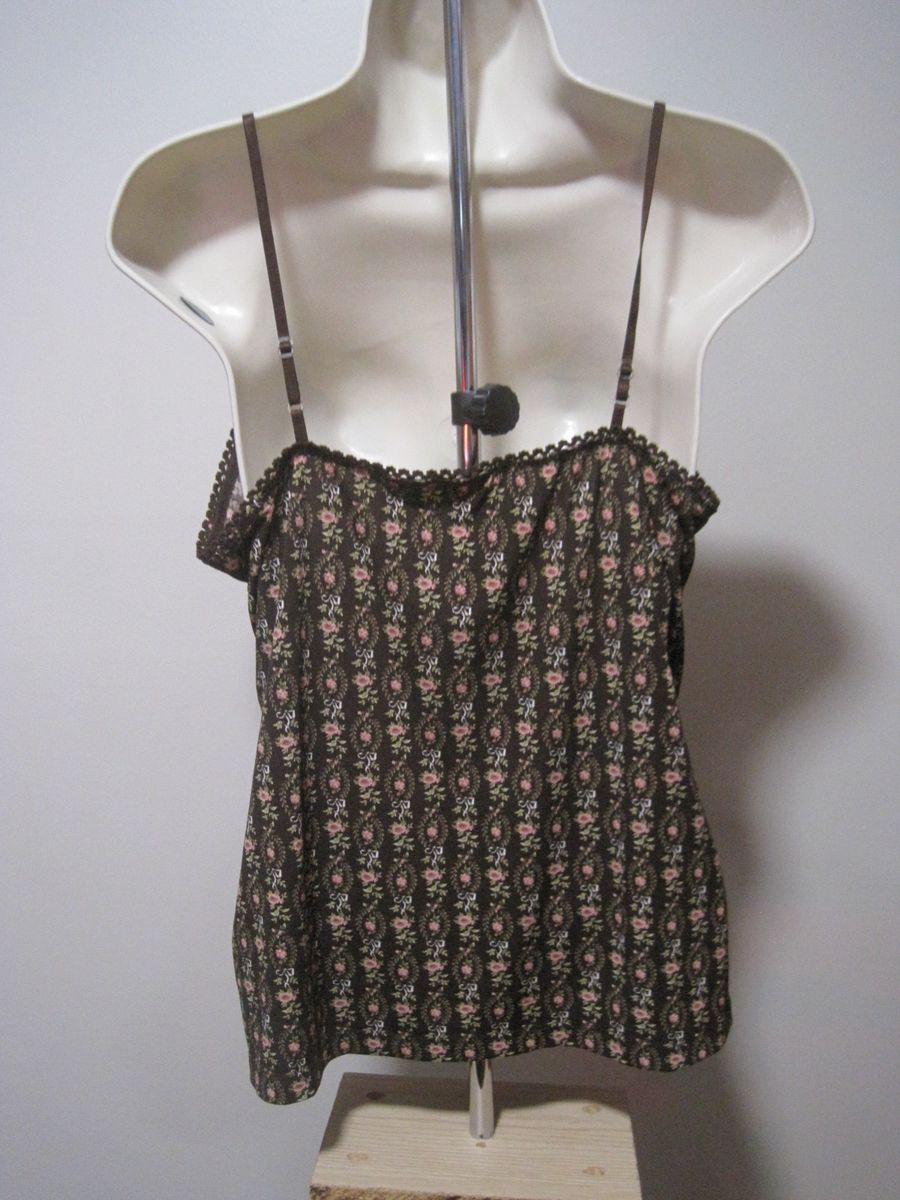 This unbranded women's medium camisole features a floral pattern with a brown color and lace trim ribbon detailing. Made from lightweight and stretchy cotton fabric, it includes adjustable straps and a tagless design for comfort. Perfect for everyday wear, this tank-style camisole is machine washable and has a regular fit, making it a versatile addition to any wardrobe. Ideal for layering or wearing on its own, this camisole combines style and practicality for a chic look.