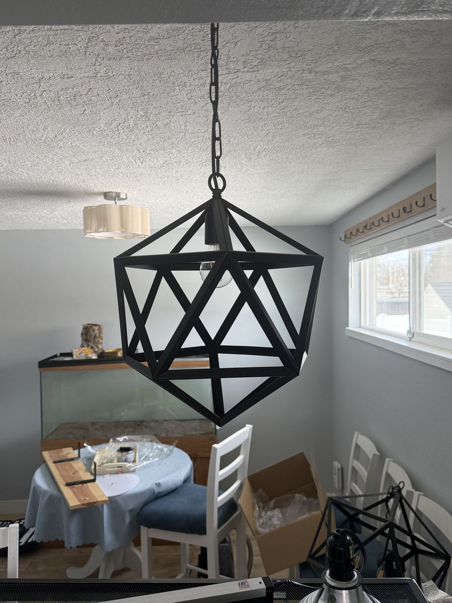 Geometric chandelier set of three. One large central chandelier and two smaller. They work well and are super neat, just way too big for our space. $150 OBO.