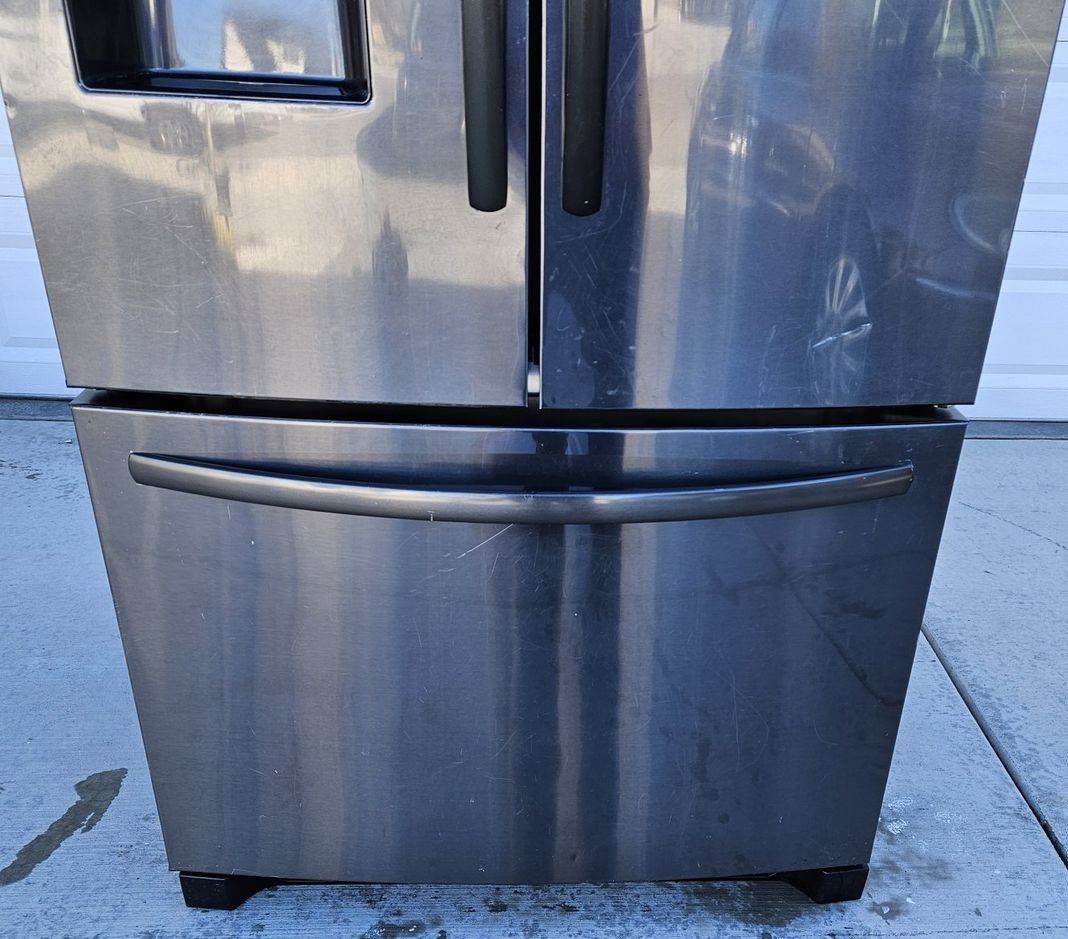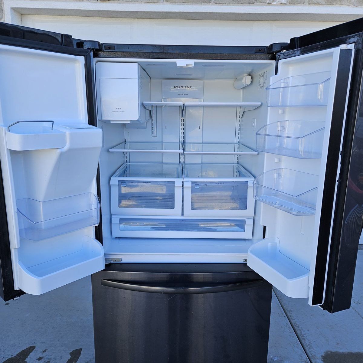 The Frigidaire FFHB2750TD8 is a 36-inch, 26.8 cu. ft. French door refrigerator in black stainless steel, featuring EvenTemp™ technology, multi-level LED lighting, and an in-door ice/water dispenser. It is a standard-depth unit known for its spacious, adjustable interior, generally well-regarded for performance, though some users report average ice production speeds Actual Width (Inches) 35.875