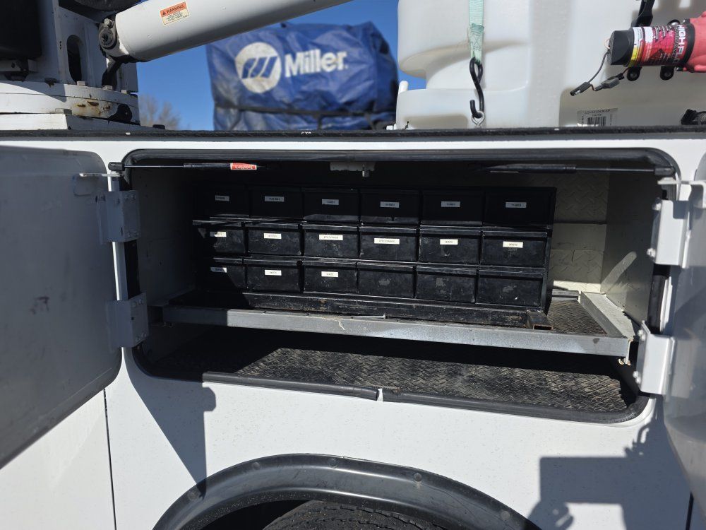 162,XXX miles 11' Auto Crane Bed 6000 Pound Electric Crane 27' Vertical Lift 20' Horizontal Reach, Wired and Wireless Controllers Manual Outriggers Miller Bobcat 225 welder with leads Torch Set and Bottles Included Gas Powered Air Compressor Tool Boxes and Bolt Bins 24" work bumper 6" Wilton Vise