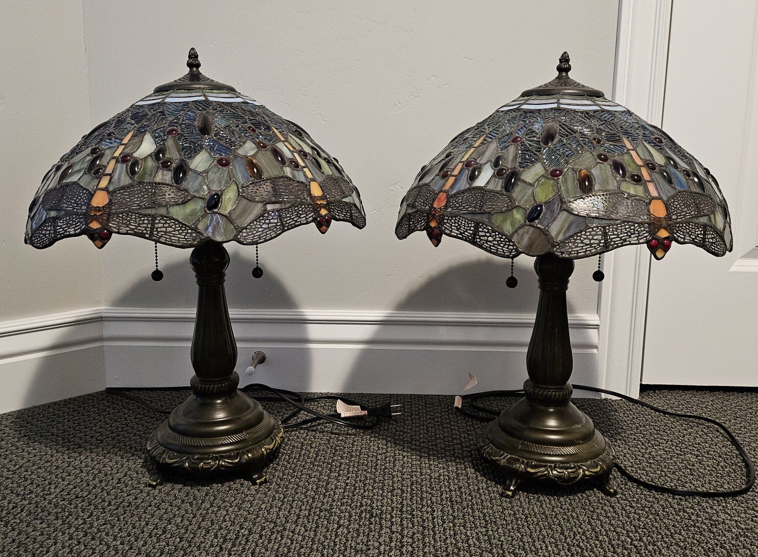 -Matching pair of table lamps -Heavy decorative metal bases -Ripple glass shade with jewel accents Works perfectly -Perfect for nightstands, living room end tables, or office décor