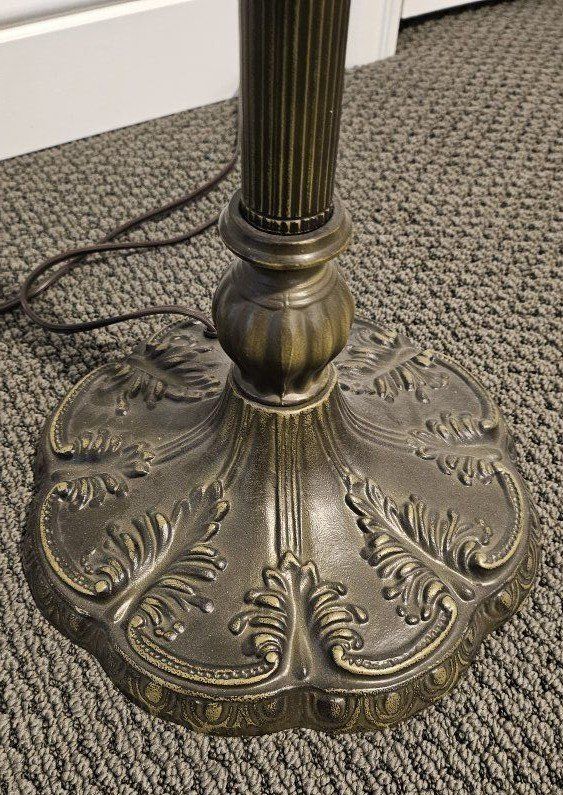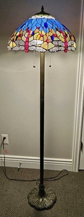 Tiffany-style dragonfly floor lamp with ripple glass and colorful jewel accents. Heavy decorative metal base and pierced dragonfly wings make this lamp a showpiece in any room. Looks amazing when lit.