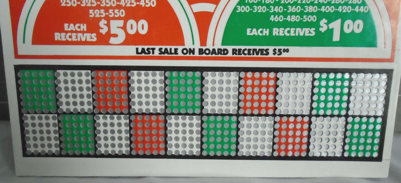 While some boards offered small prizes like cigarettes or candy the one would pay off in cash. Inside the boards holes are tiny slips of paper with numbers printed on them. If the paper had one of the winning numbers shown on the advertising portion of the punchboard, they won $1.00 or $5.00. This punchboard is very well preserved with NO HOLES having been punched. The metal punch piece is still sealed on the back.