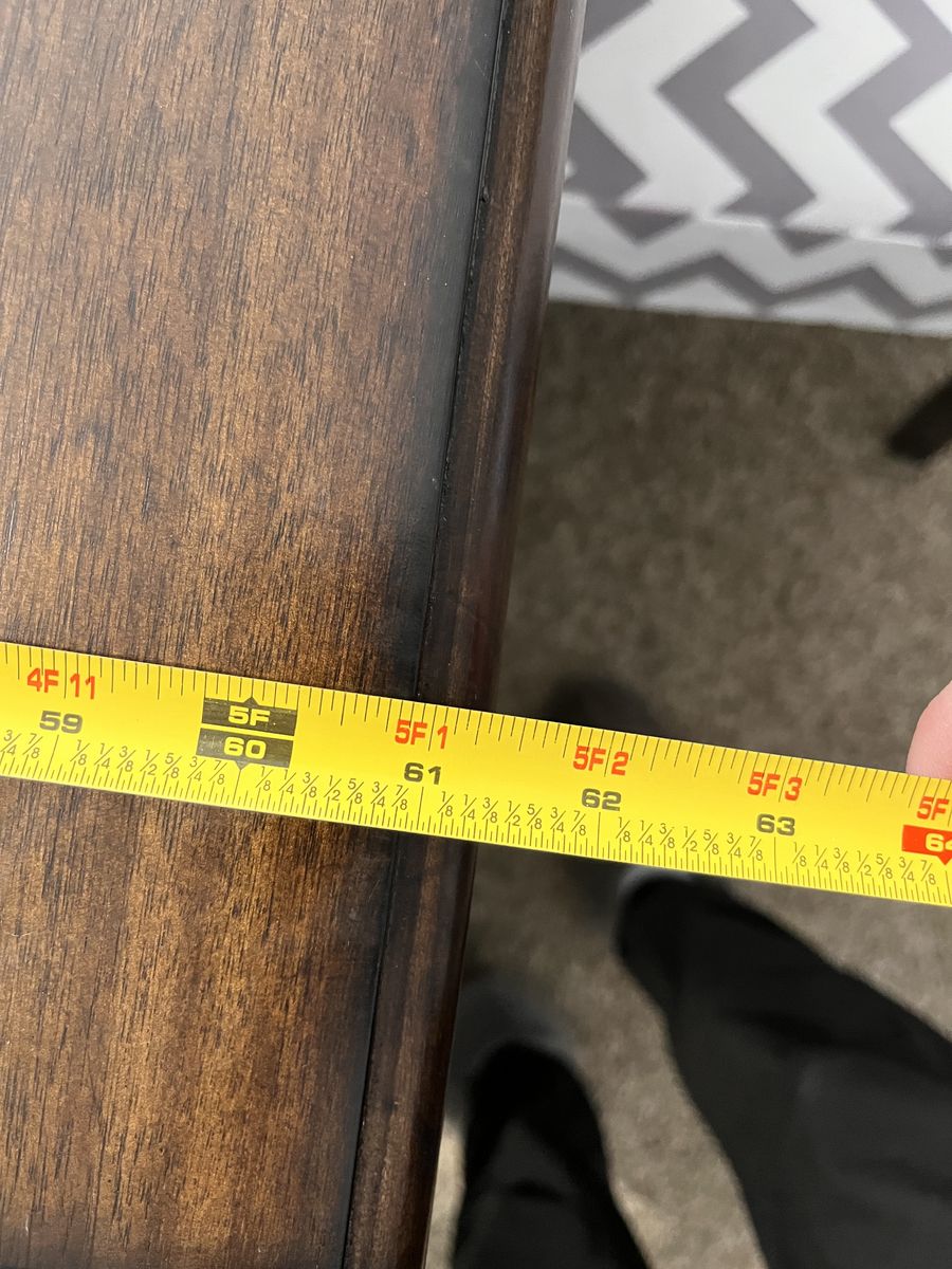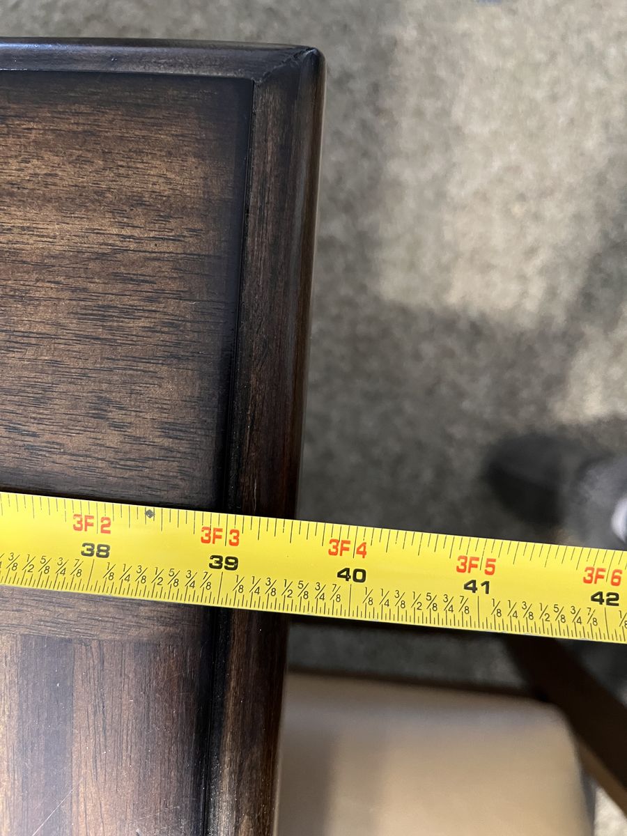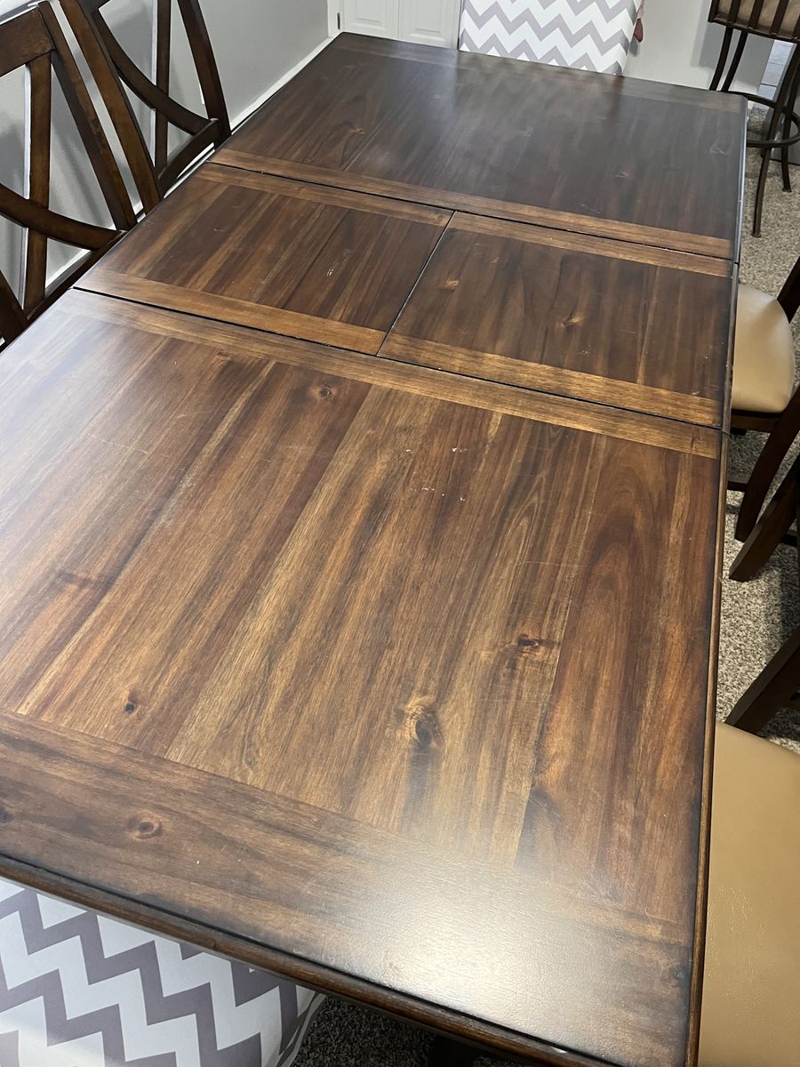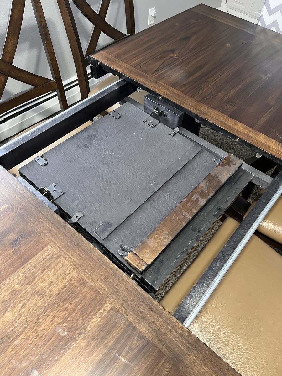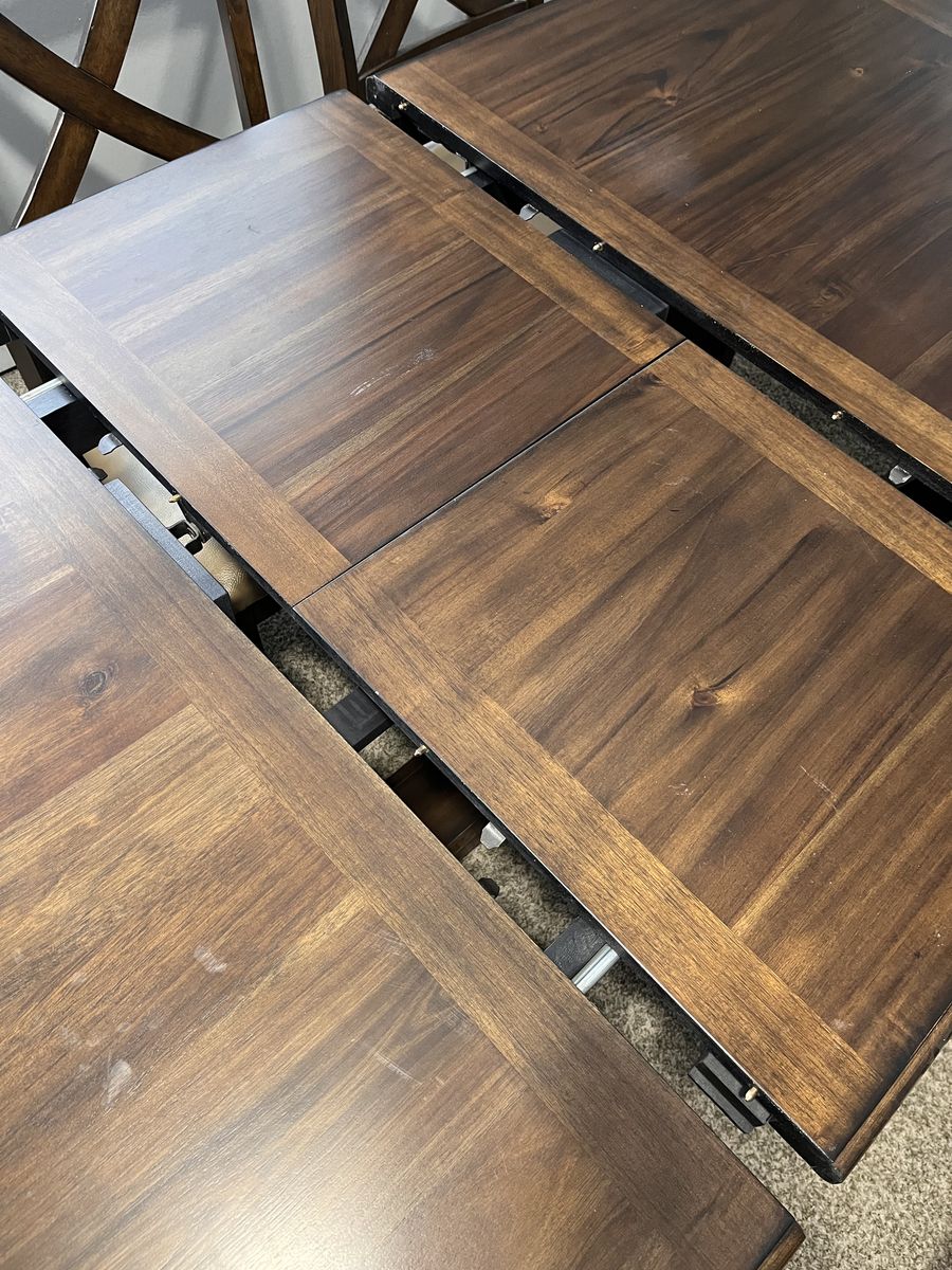 VenmoA beautiful expresso brown table, with lovely grain, and decorative leg design. It has a hidden leaf that is easy to pull out. The pictures show the measurements - 39.5" x 61" without the leaf, 39.5" x 79.5" with the leaf in.