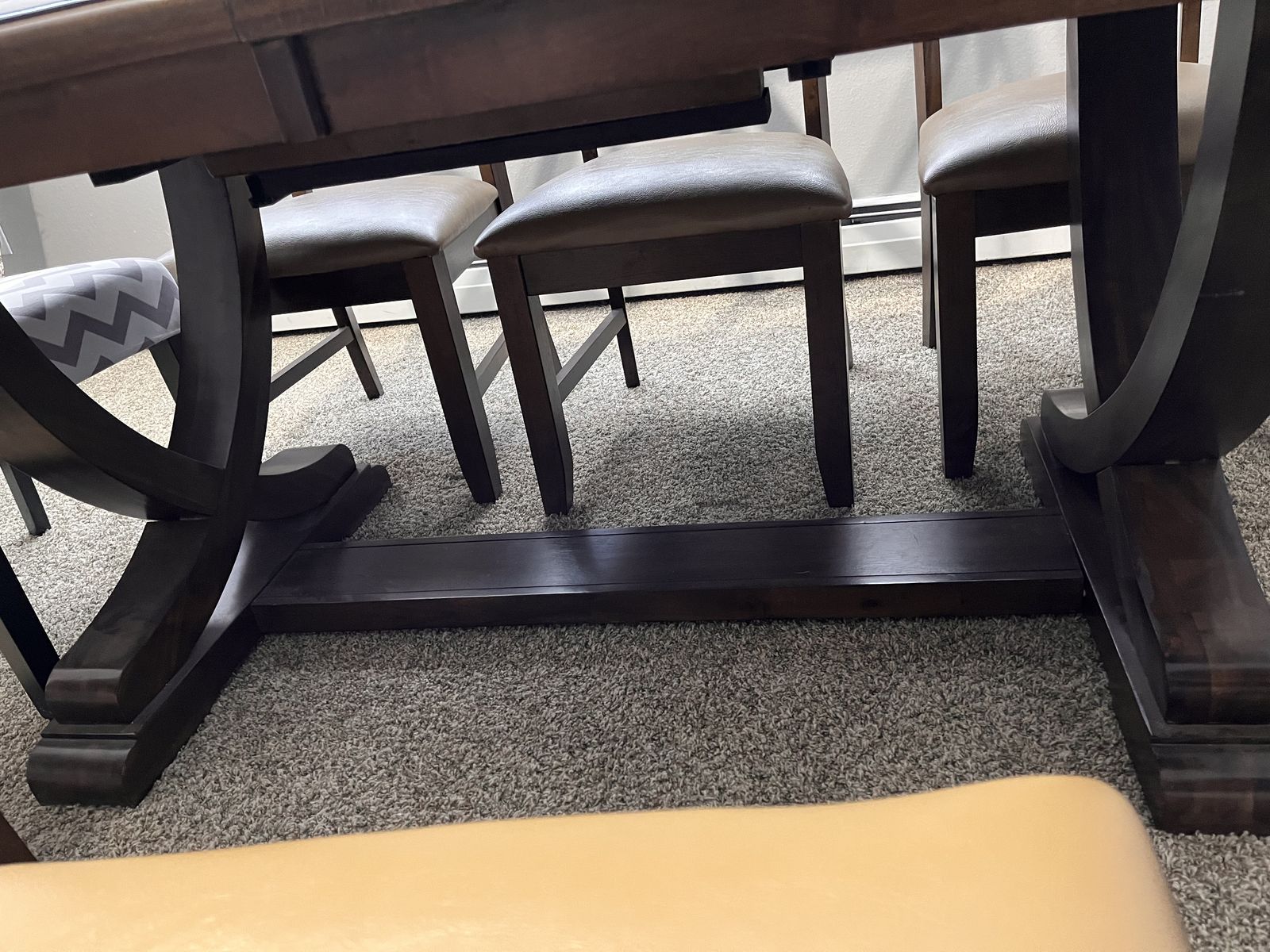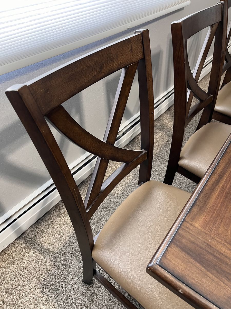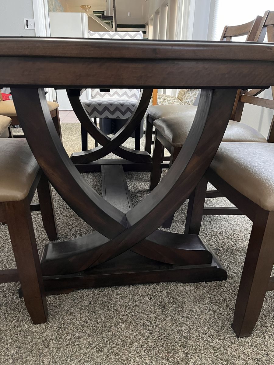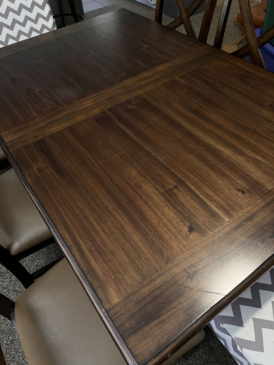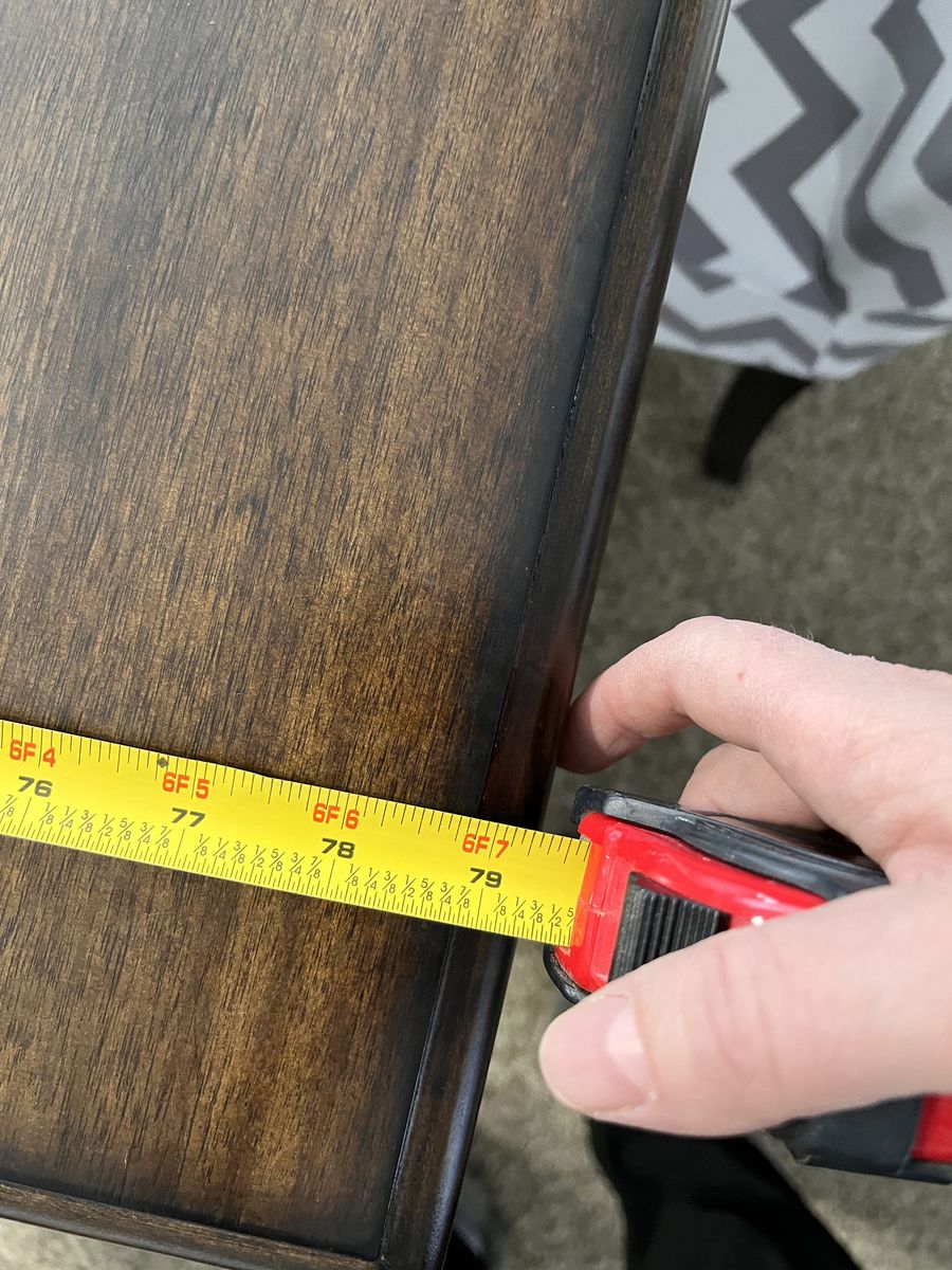 VenmoA beautiful expresso brown table, with lovely grain, and decorative leg design. It has a hidden leaf that is easy to pull out. The pictures show the measurements - 39.5" x 61" without the leaf, 39.5" x 79.5" with the leaf in.