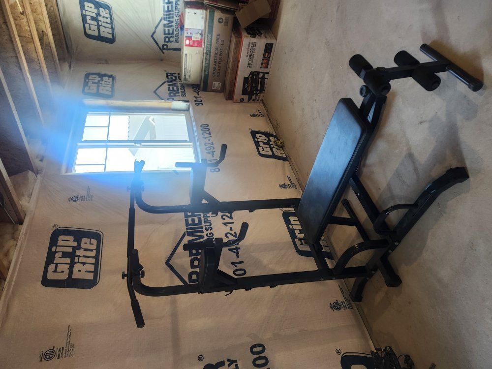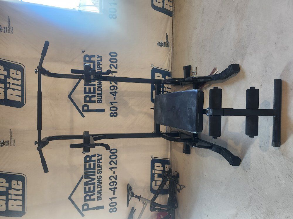 work out machine with bench press and weights. missing one bolt but you can get it from homedepot . and pull up bar .