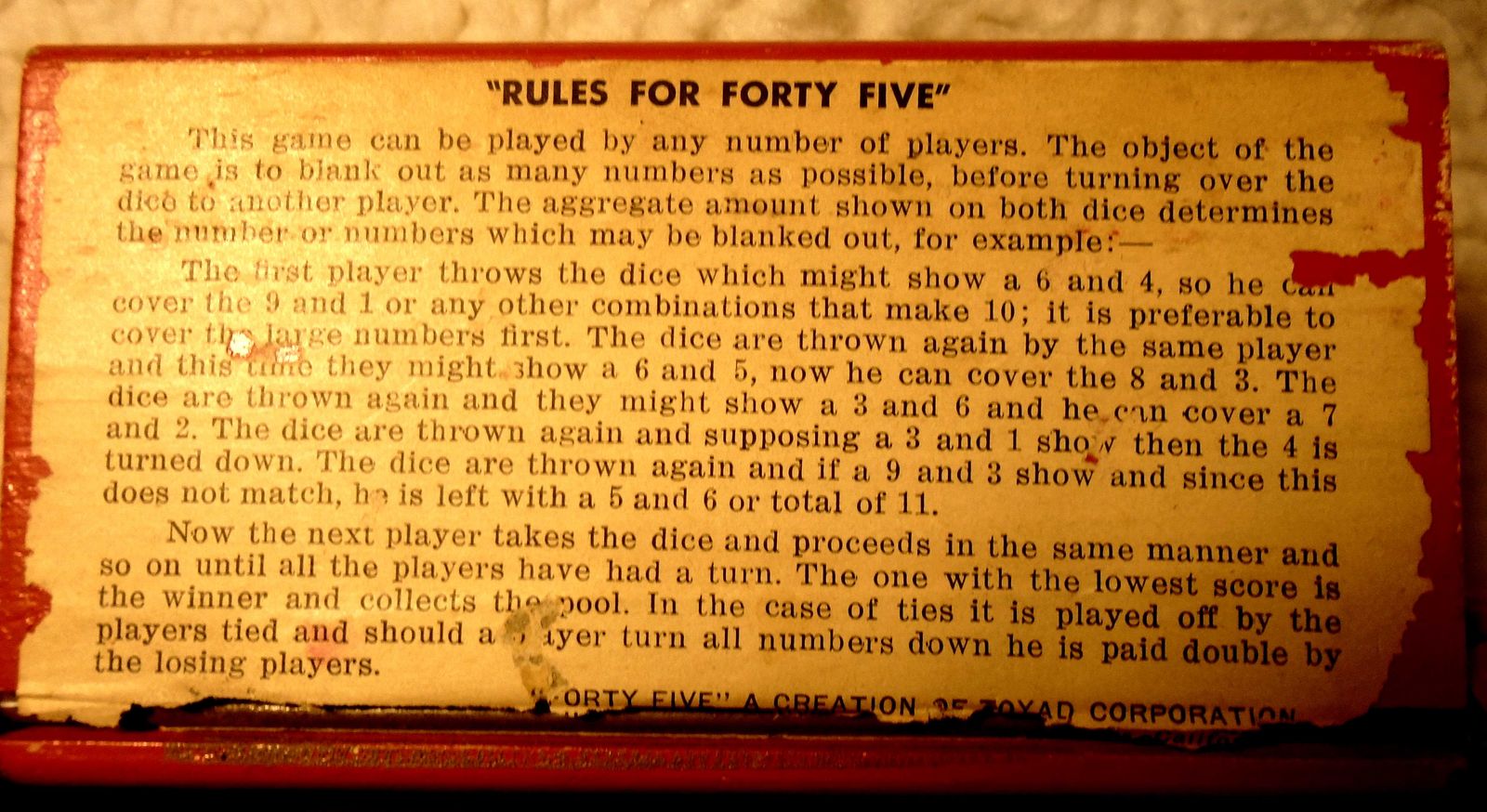 The first player throws the dice which might show a 6 and 4, so they can cover the 9 and 1 or any other combination which makes 10; it is preferable to cover the larger numbers first. The dice are thrown again by the same player and this time they may show a 6 and a 5, now they can cover the 8 and the 3. The dice are thrown again and may show a 3 and 6 and they can cover the 7 and 2. The dice are thrown again and supposing a 3 and 1 show, then the 4 is turned down. The dice are thrown again and if a 9 and 3 are shown, and since this does not match, they are left with a 5 and 6 a total of 11.