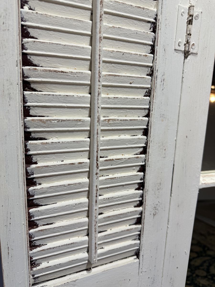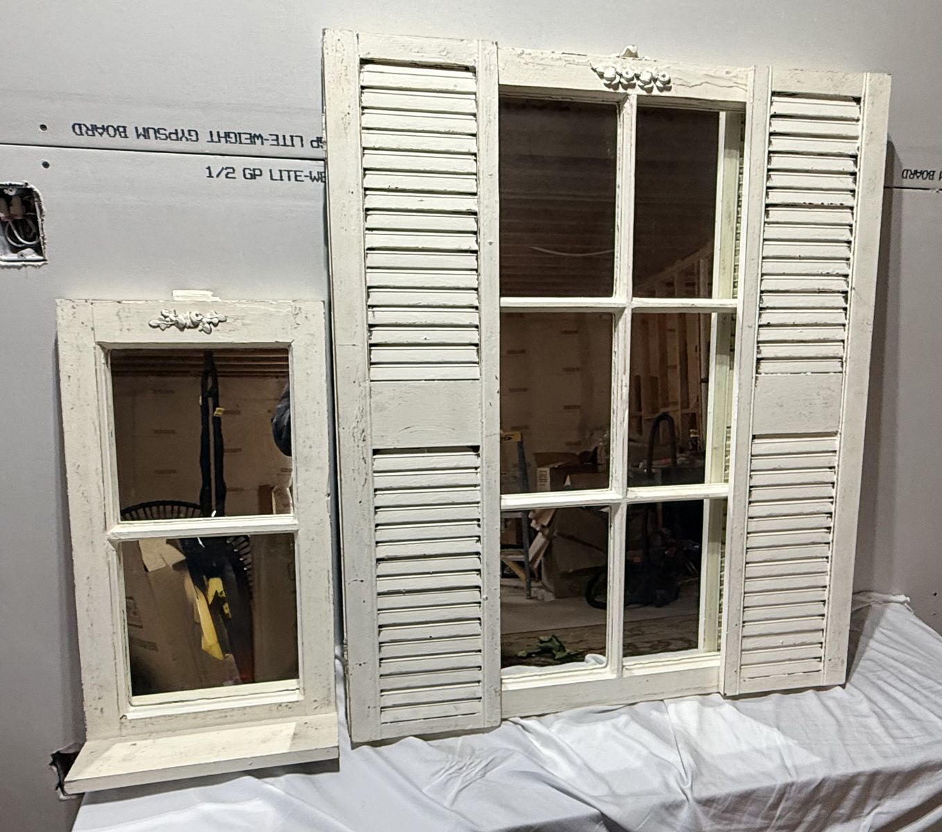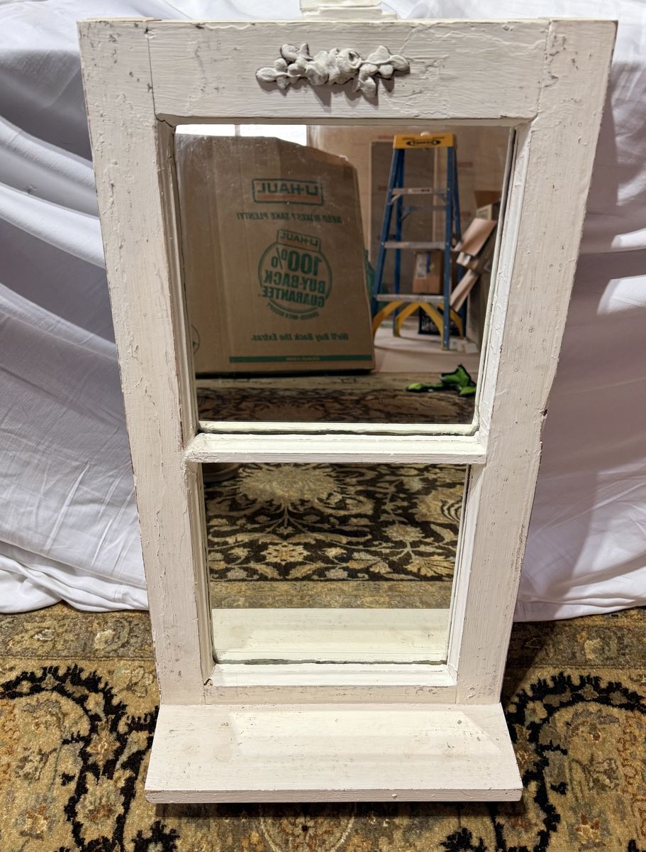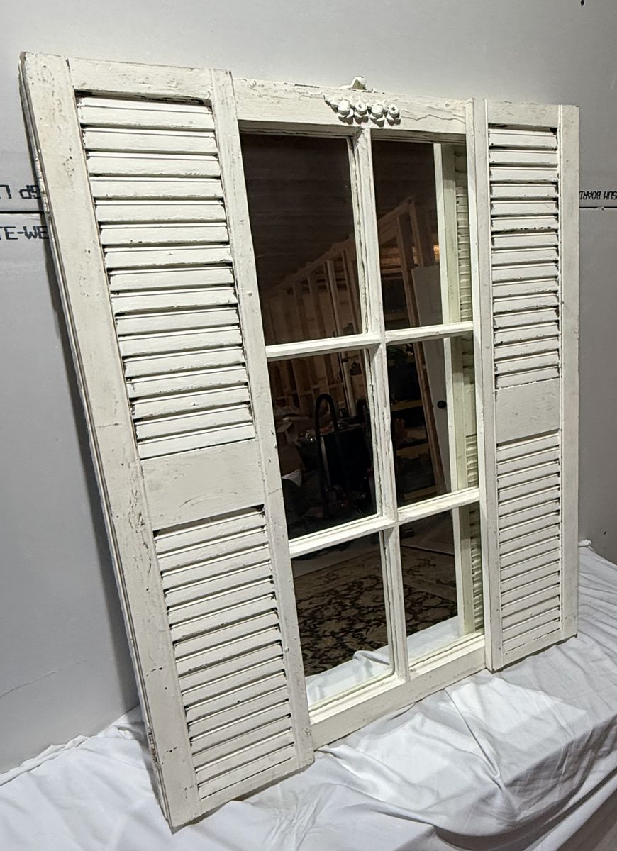 VenmoFor sale are two antique/vintage window frames with mirrors. One of the window frames has shutters. They have a distressed white finish. The small one has a shelf that can be used to display small items. The small one is 13.25 W x 25.5 H. The larger window is 32.5 W x 39 H with the shutters closed. It is 50.75 W with the shutters open. This is a unique set of mirrors and would look great in your house.