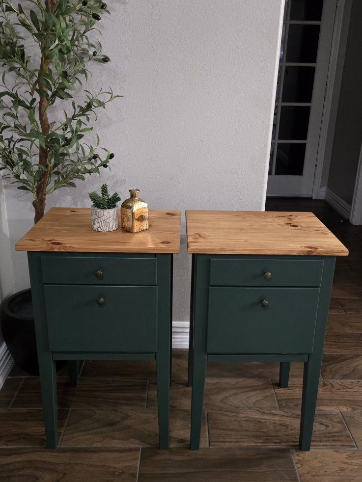 Beautiful solid wood nightstands in great shape. 29" tall 18" long 16" deep. First come first serve. Sorry no holds. Hunter green/natural wood top.