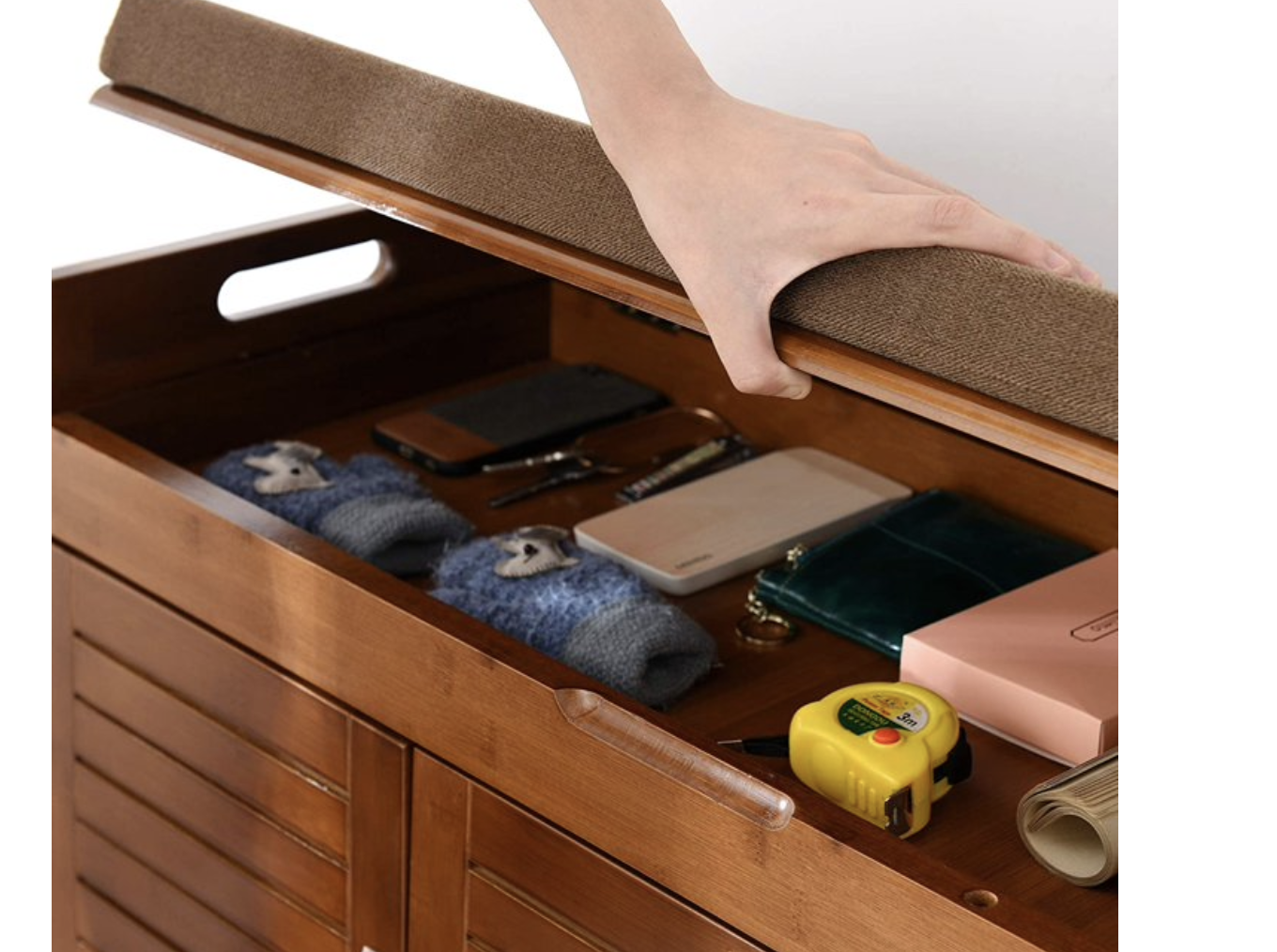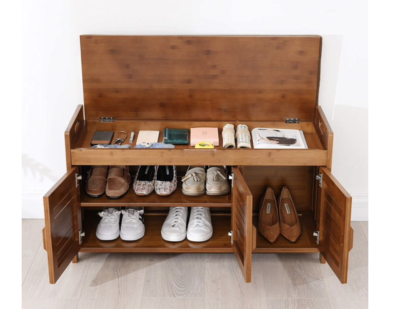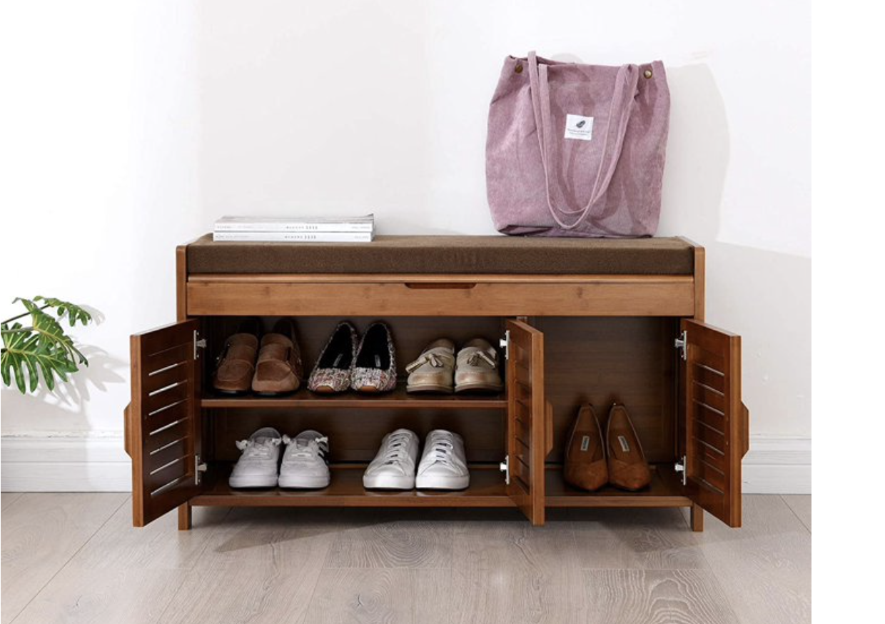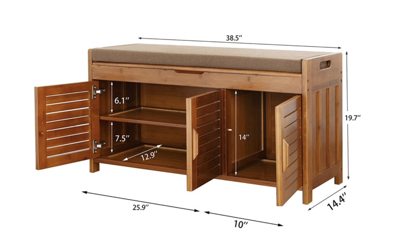 Measures 38.5 inches (L) x 14.4 inches (W) x 19.7 inches (H), Comfortable Seating: Features a soft-cushioned top for comfortable shoe changing, suitable for various indoor and outdoor settings. Premium Construction: Crafted from 100% natural bamboo, carefully polished for durability, and includes a high-density sponge cushion with removable, cleanable flannel. Hidden Storage: Offers a concealed compartment for organizing shoe polish, brushes, socks, keys, and other small items. Ventilated Design: Shuttered doors provide ventilation to prevent odors, with a design that allows for seasonal removal or installation. Generous Dimensions: Measures 38.5 inches (L) x 14.4 inches (W) x 19.7 inches (H), providing ample space. Enhanced Design: Upgraded with a deeper depth and higher height compared to older models, accommodating larger shoes.