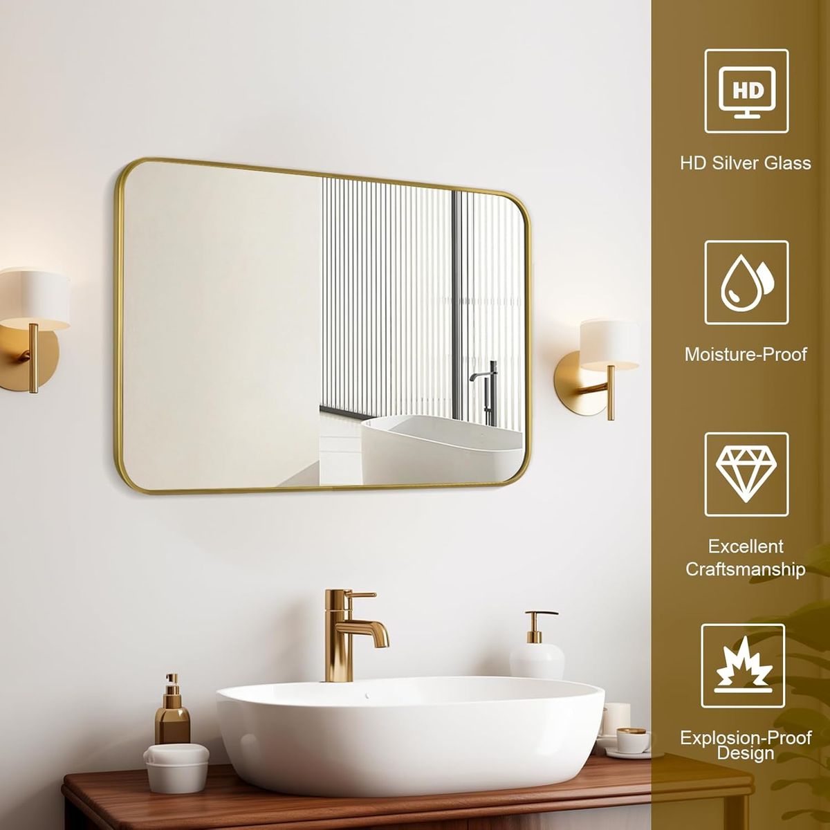 ApplePayGold Wall Mirror for Bathroom 30X36 Inch Stainless Steel Metal Frame Bathroom Vanity Mirror Rounded Rectangle Mirror Rustproof for Entryway, Living Room Hangs Vertically or Horizontally