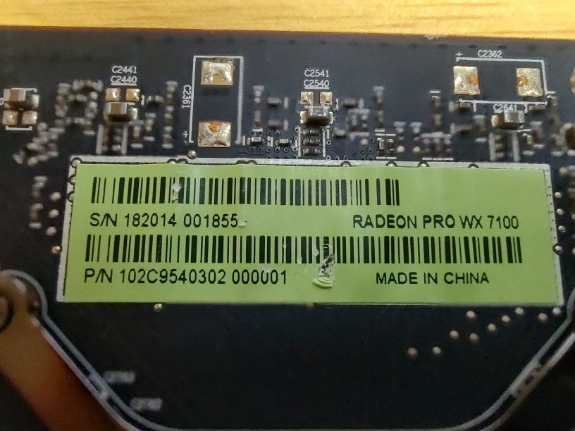 VenmoUp for sale is an AMD Radeon Pro WX 7100 GPU that has served me well. Has new thermal paste applied, but kept the original thermal pads as I did not have any on hand. Runs great for me with no issues. Requires 1x 6-pin PCIe power connector from the PSU to work.