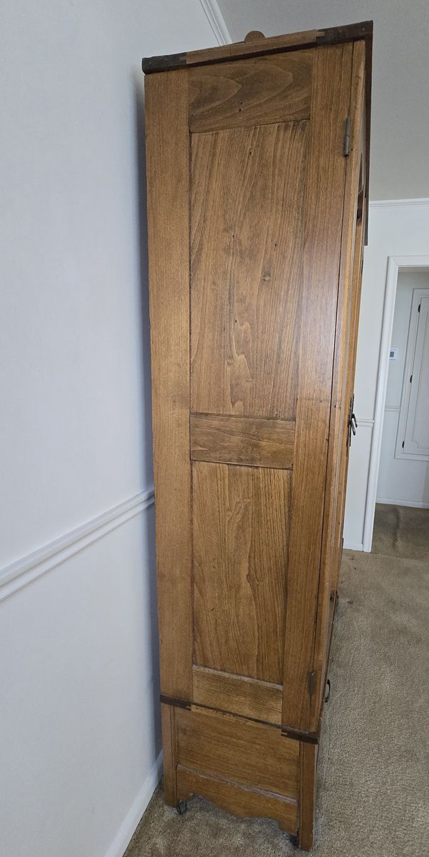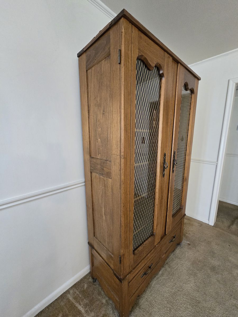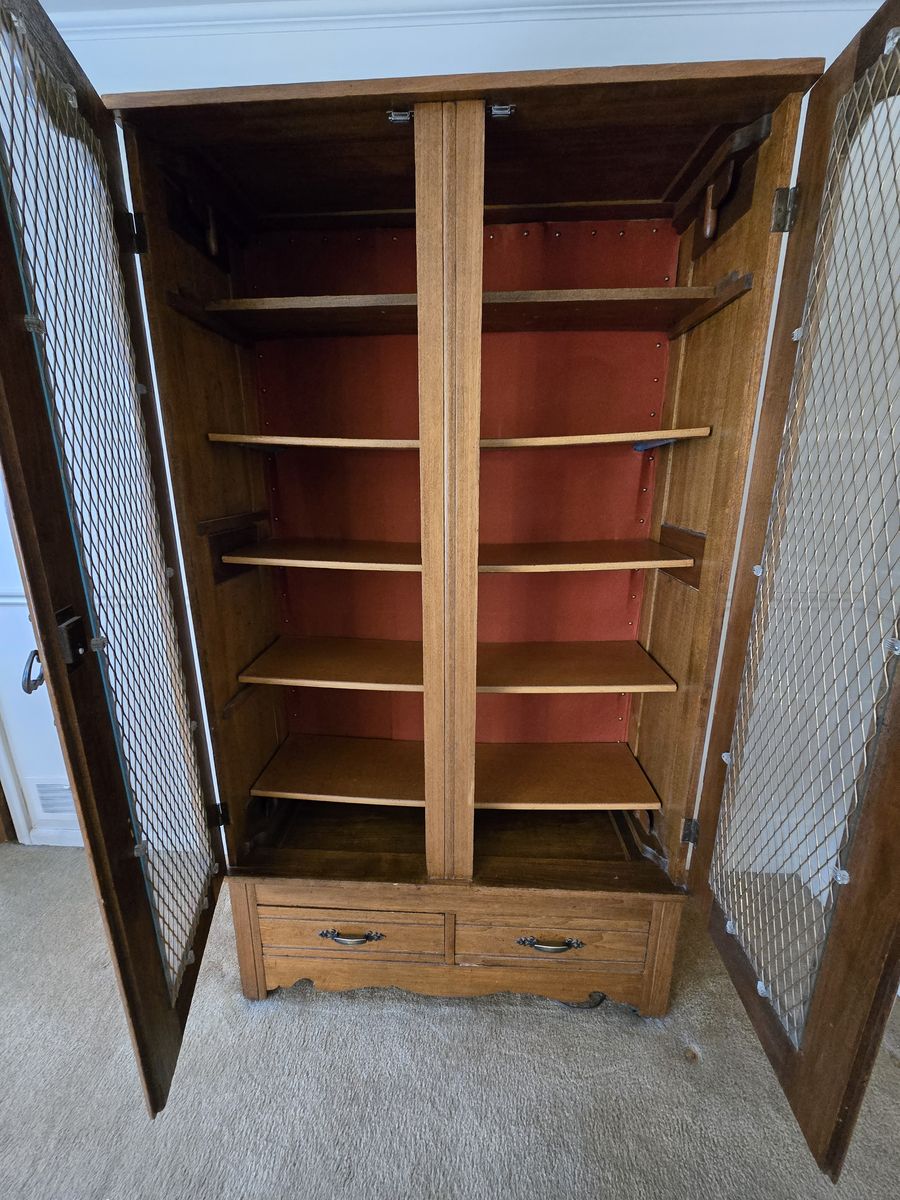 ZelleBeautiful bookcase with glass inlay doors, 5 large shelves and 2 pull out drawers. Found in old family farmhouse that was built in 1893. Unsure of exact age of furniture but restored in 1970's. Measures 78 1/2 in tall X 44 1/4 in wide X 18 in deep. Will need to pick up, no delivery available.