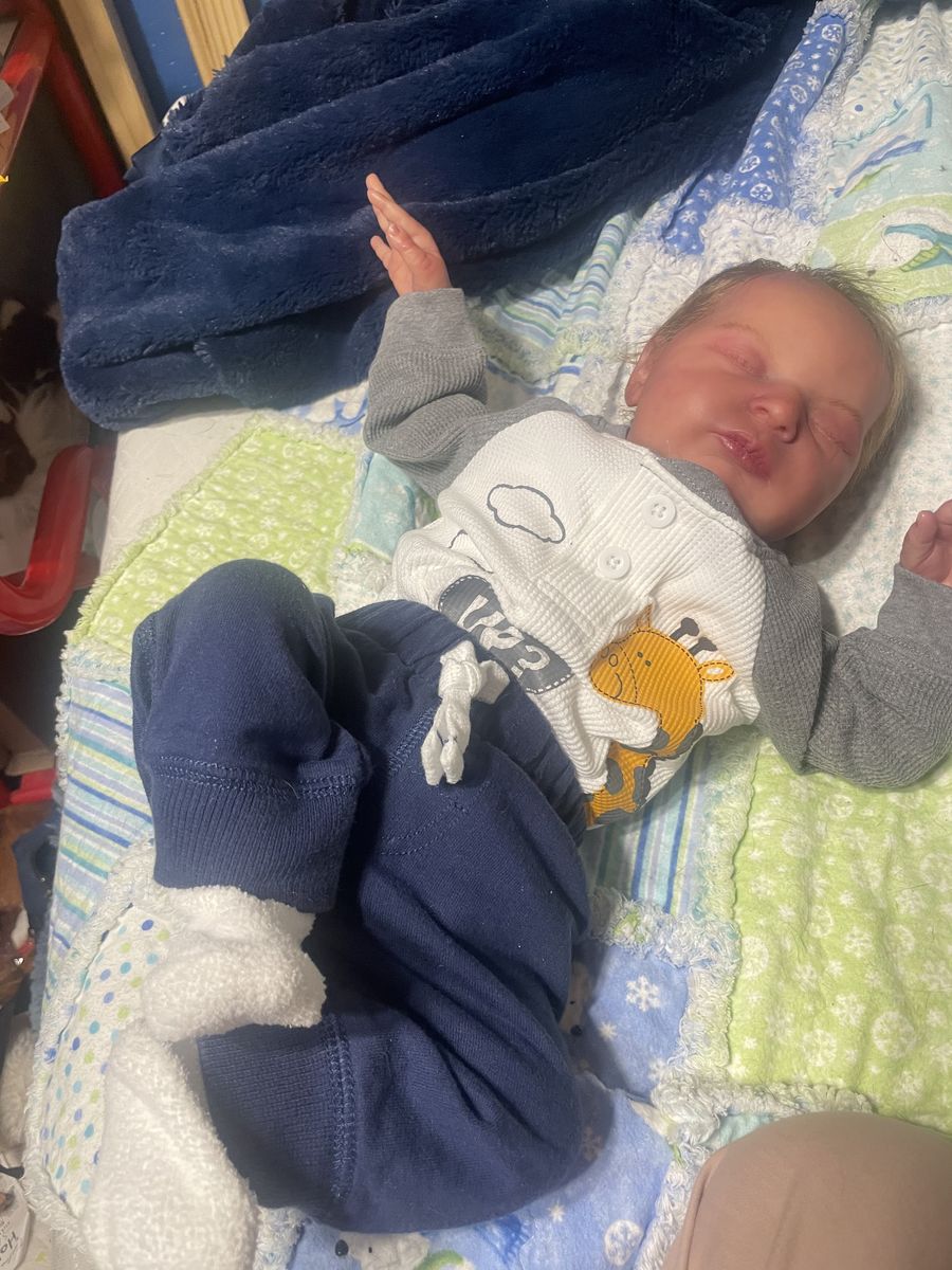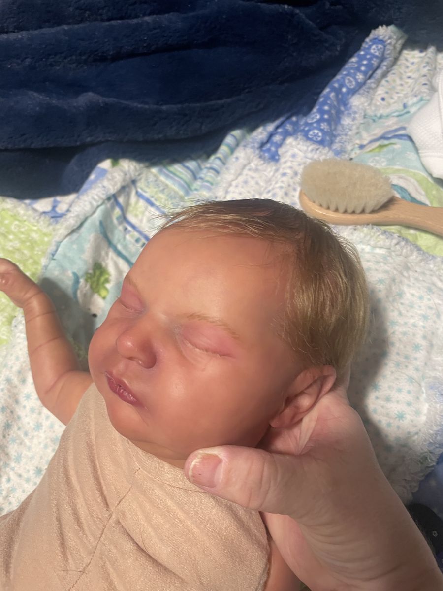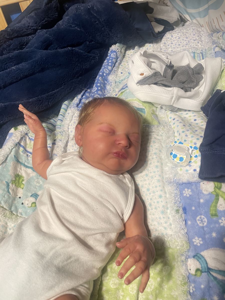 In excellent condition. She’s nicely weighted and has a scratch on the face. Makes a cute boy out girl. Has a magnet for a pacifier. Will come with a onesie and an outfit. She’s painted with heat set paints and weighted with glass beads and stuffing. I have added dreft beads to her for a baby smell.