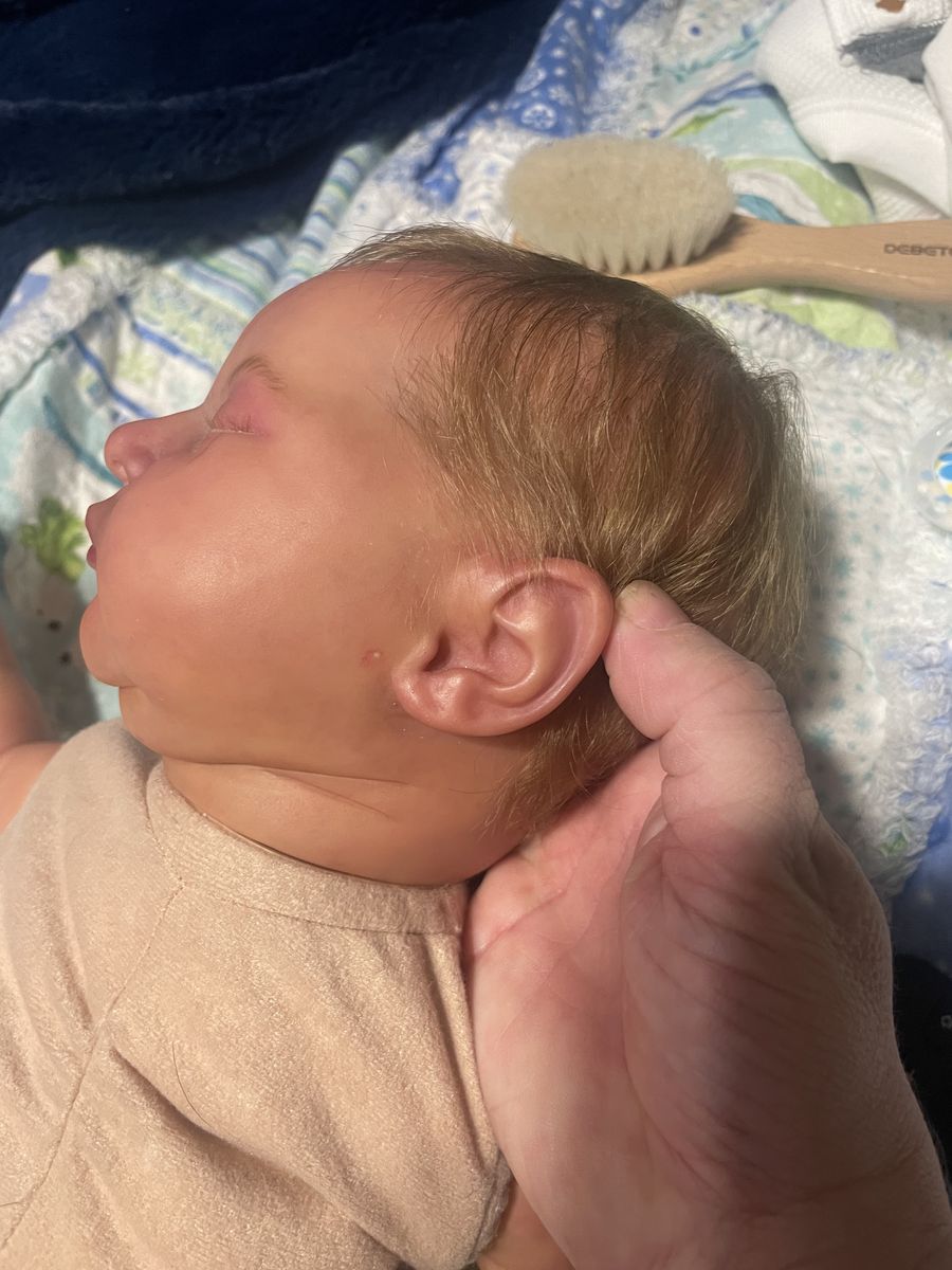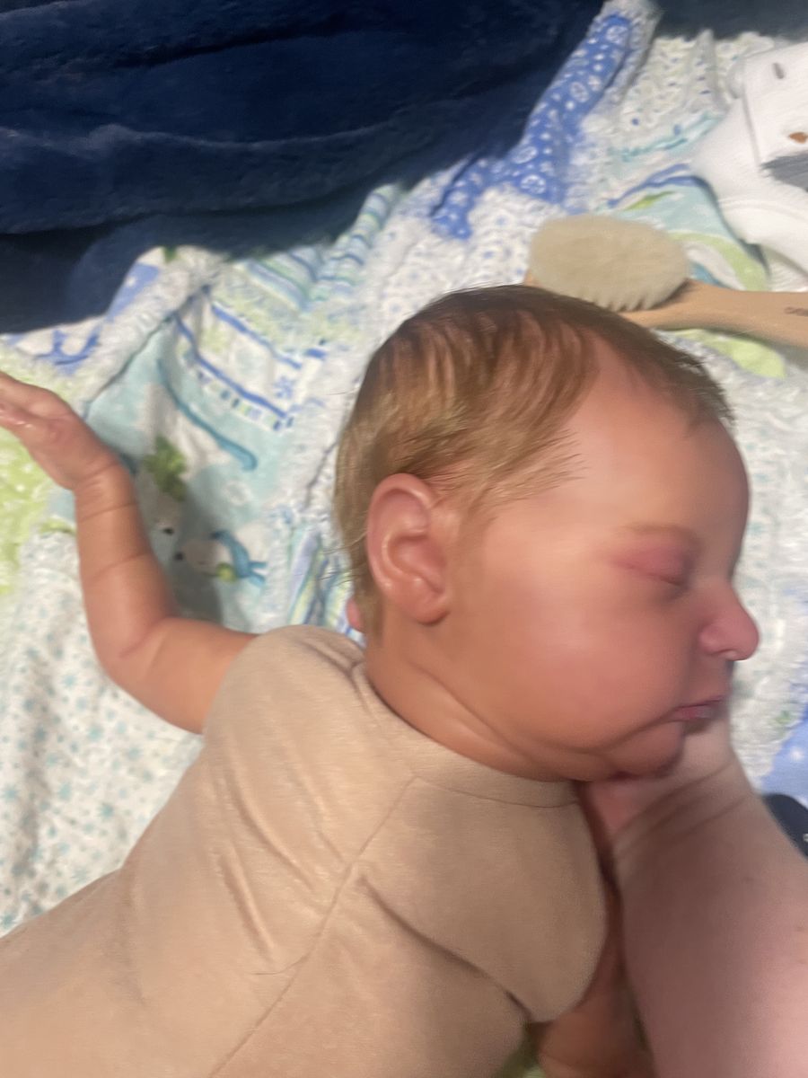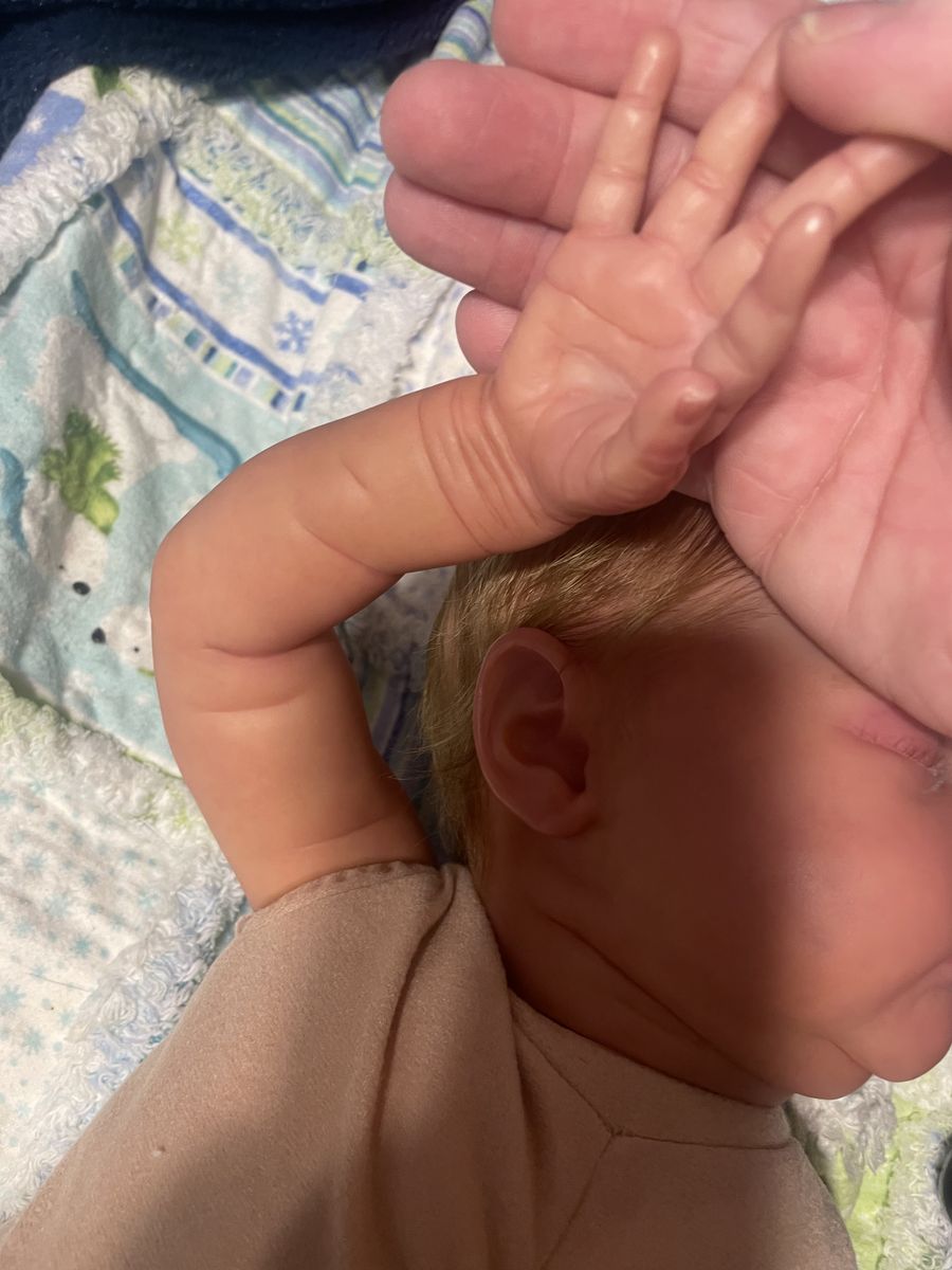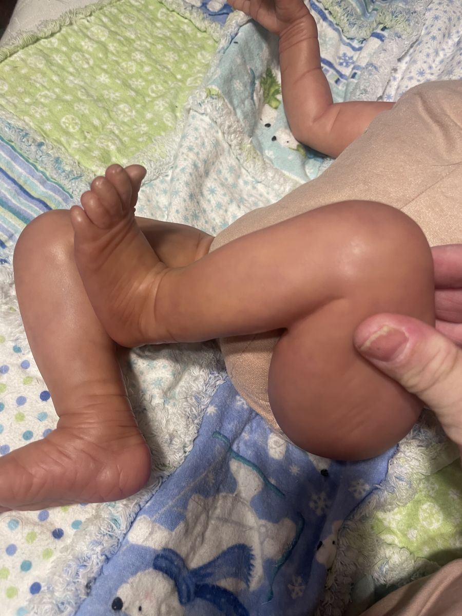 In excellent condition. She’s nicely weighted and has a scratch on the face. Makes a cute boy out girl. Has a magnet for a pacifier. Will come with a onesie and an outfit. She’s painted with heat set paints and weighted with glass beads and stuffing. I have added dreft beads to her for a baby smell.