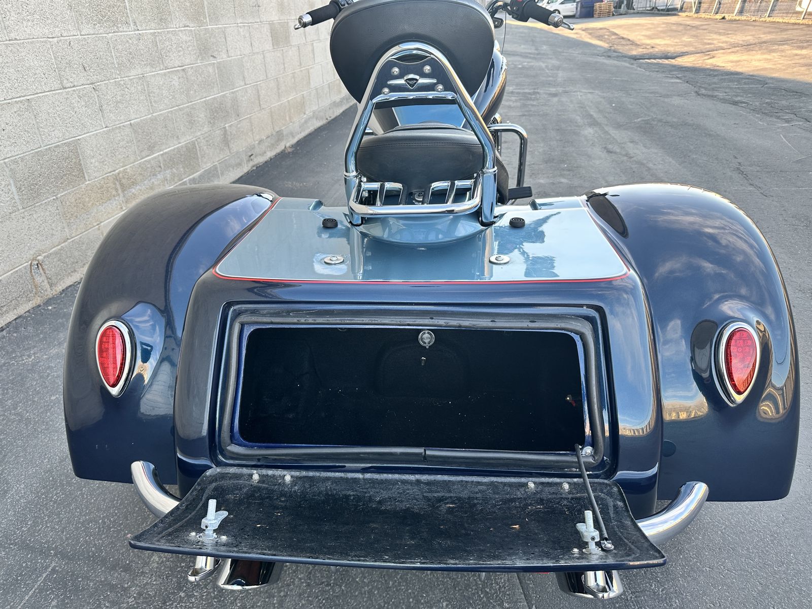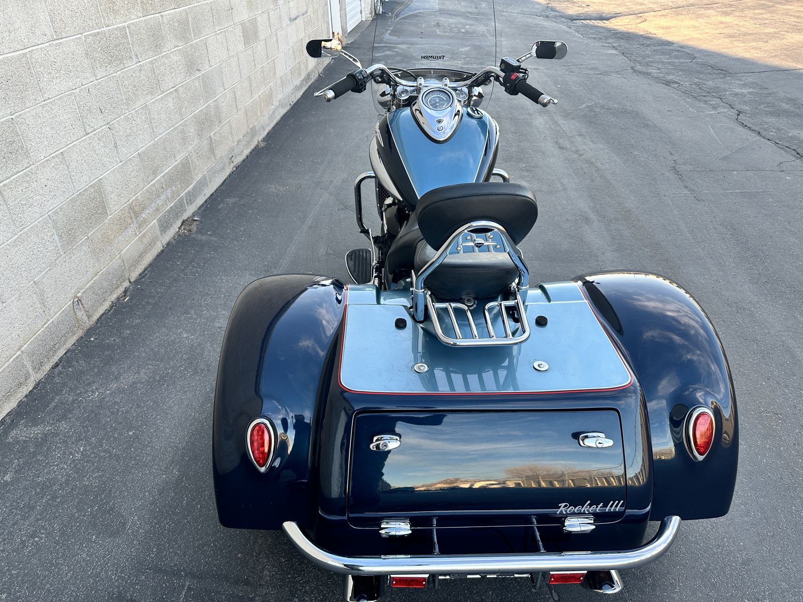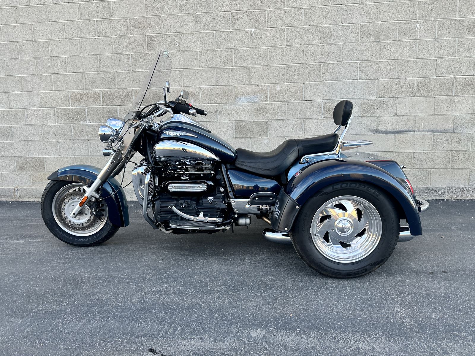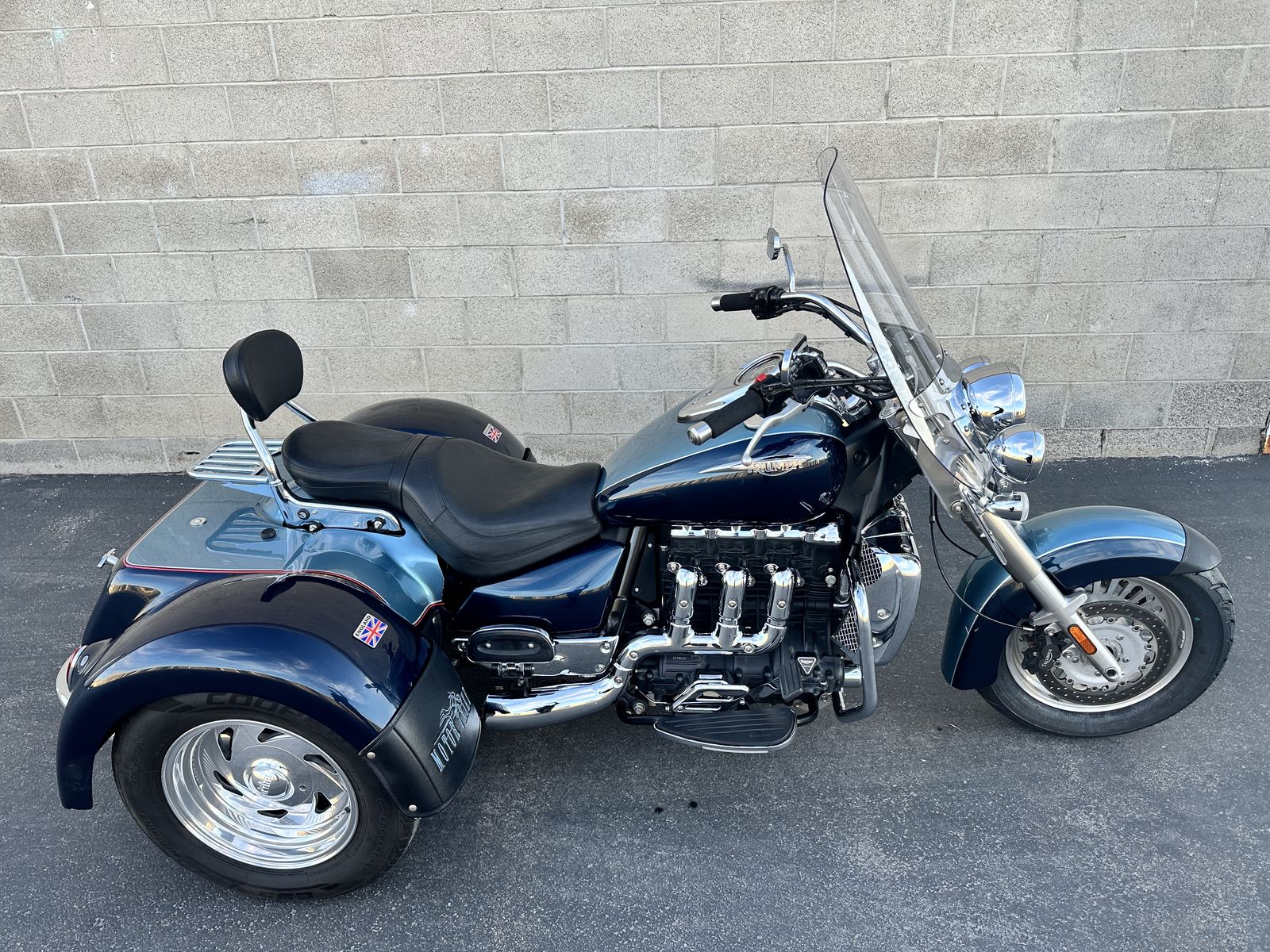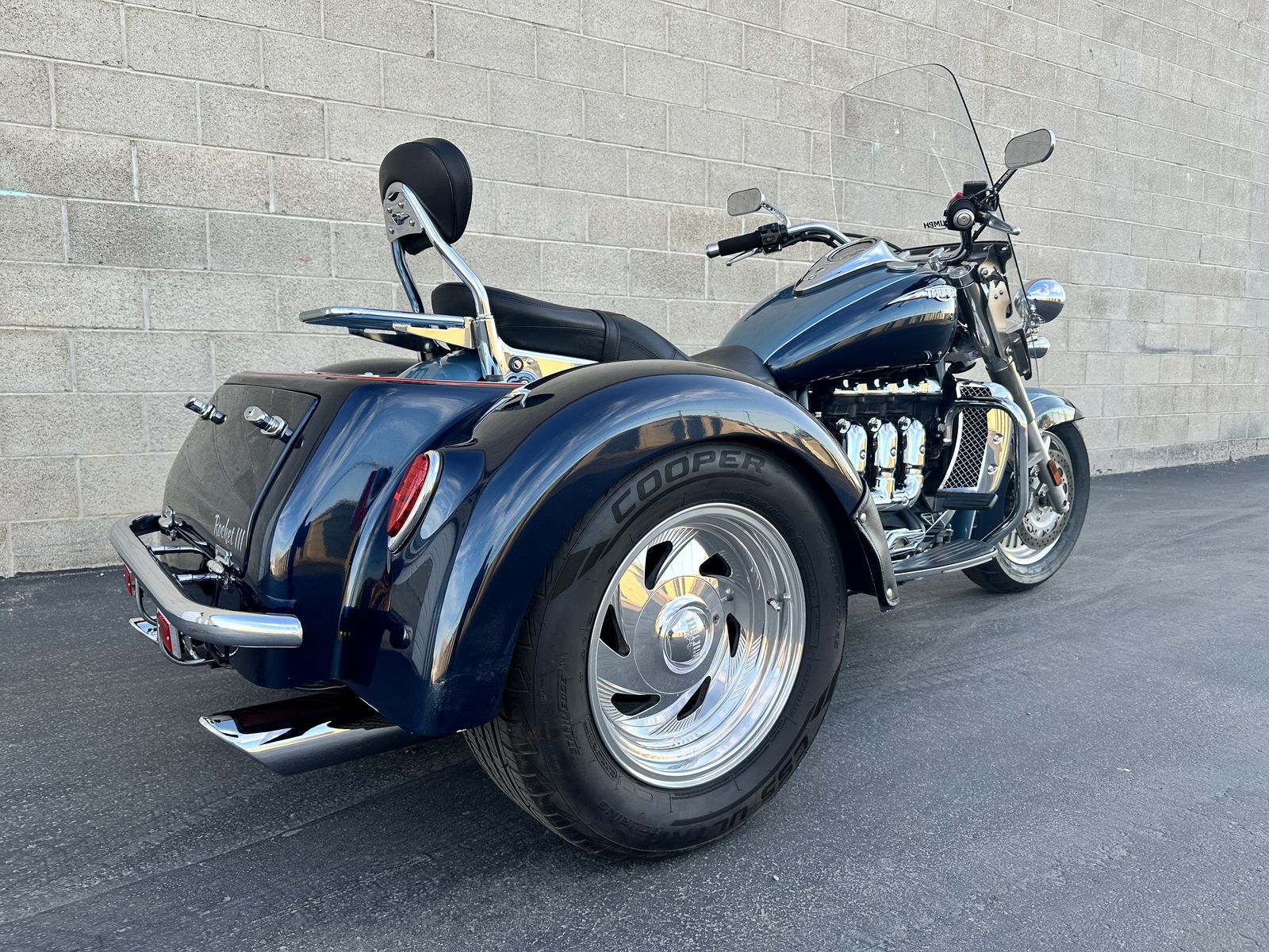 2009 Triumph Rocket III Touring with Motor Trike rear end. This is the most fun one can legally have on the road. It is so much fun to ride and it is so zippy quick and responsive. The front end has been raked out and the suspension has been upgraded. Race tech springs and Gold Valves give this gorgeous trike the best ride possible. This Triumph trike is the coolest trike around.