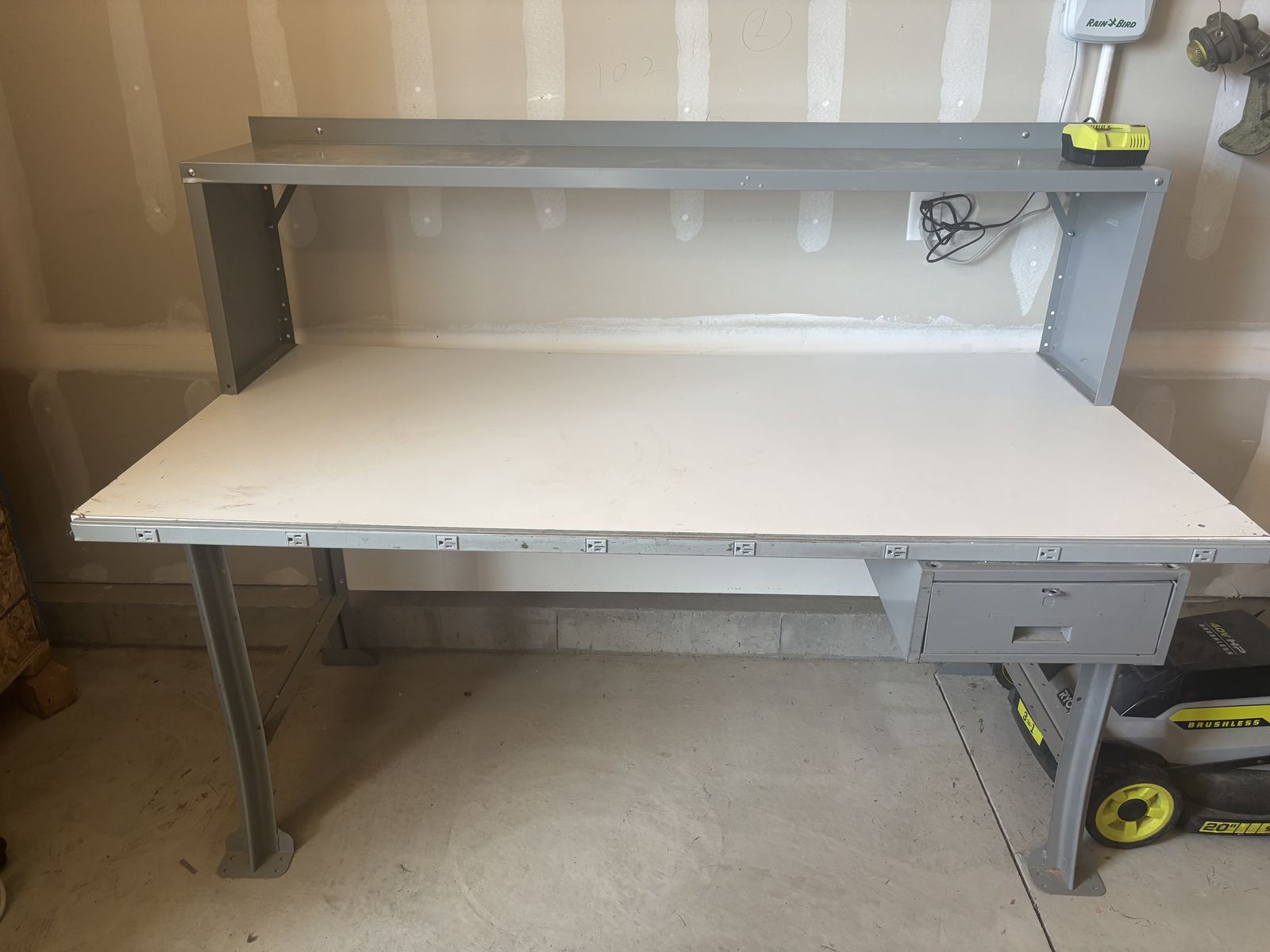 • Strong steel frame • Large work surface • Full-length upper shelf for extra storage • Built-in drawer for tools and small parts • Very sturdy and stable • Great for woodworking, DIY, mechanics, or hobby space