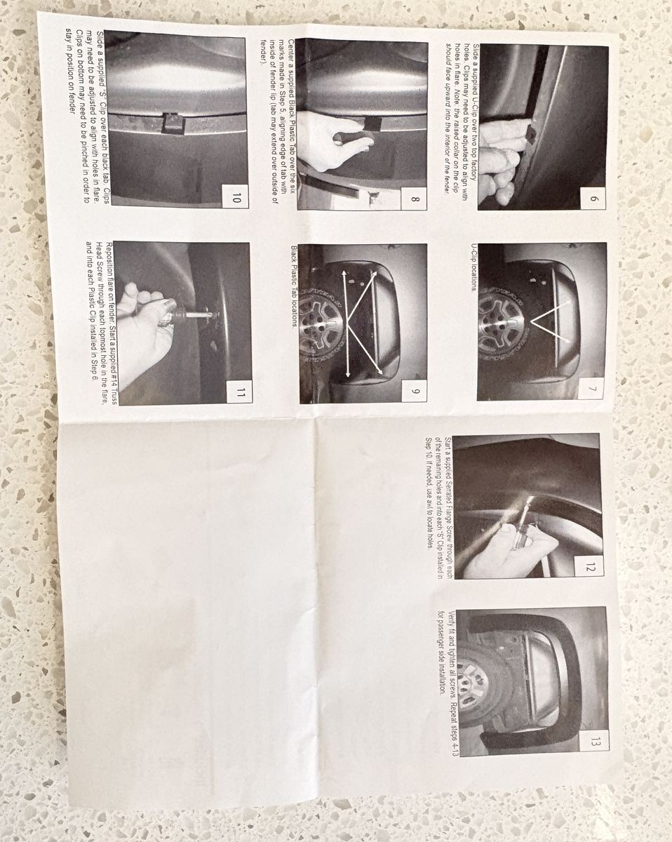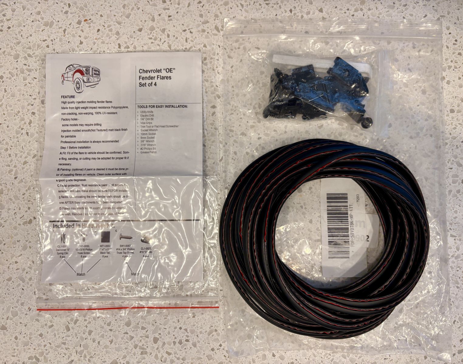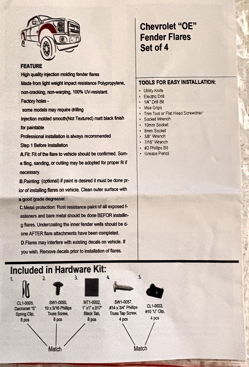 Brand new replacement hardware and rubber edge trim kit for Chevrolet OE-style fender flares (covers a complete set of 4). Includes the full roll of rubber weatherstripping to prevent body scratching, plus the complete mounting hardware kit (screws, U-clips, spring clips, and black tabs) and instructions. Perfect if you need to reinstall your flares or replace old, cracked trim! Price Firm Local Pick-up or Delivery for a fee