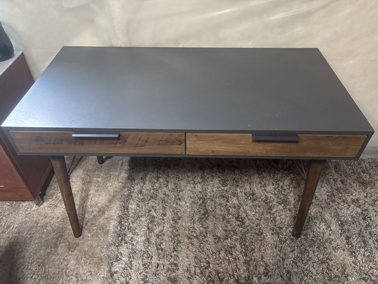 • Clean black desktop surface • Warm wood drawer fronts and legs • Two smooth-gliding storage drawers • Minimalist modern look • Compact footprint — great for bedrooms, offices, or study spaces