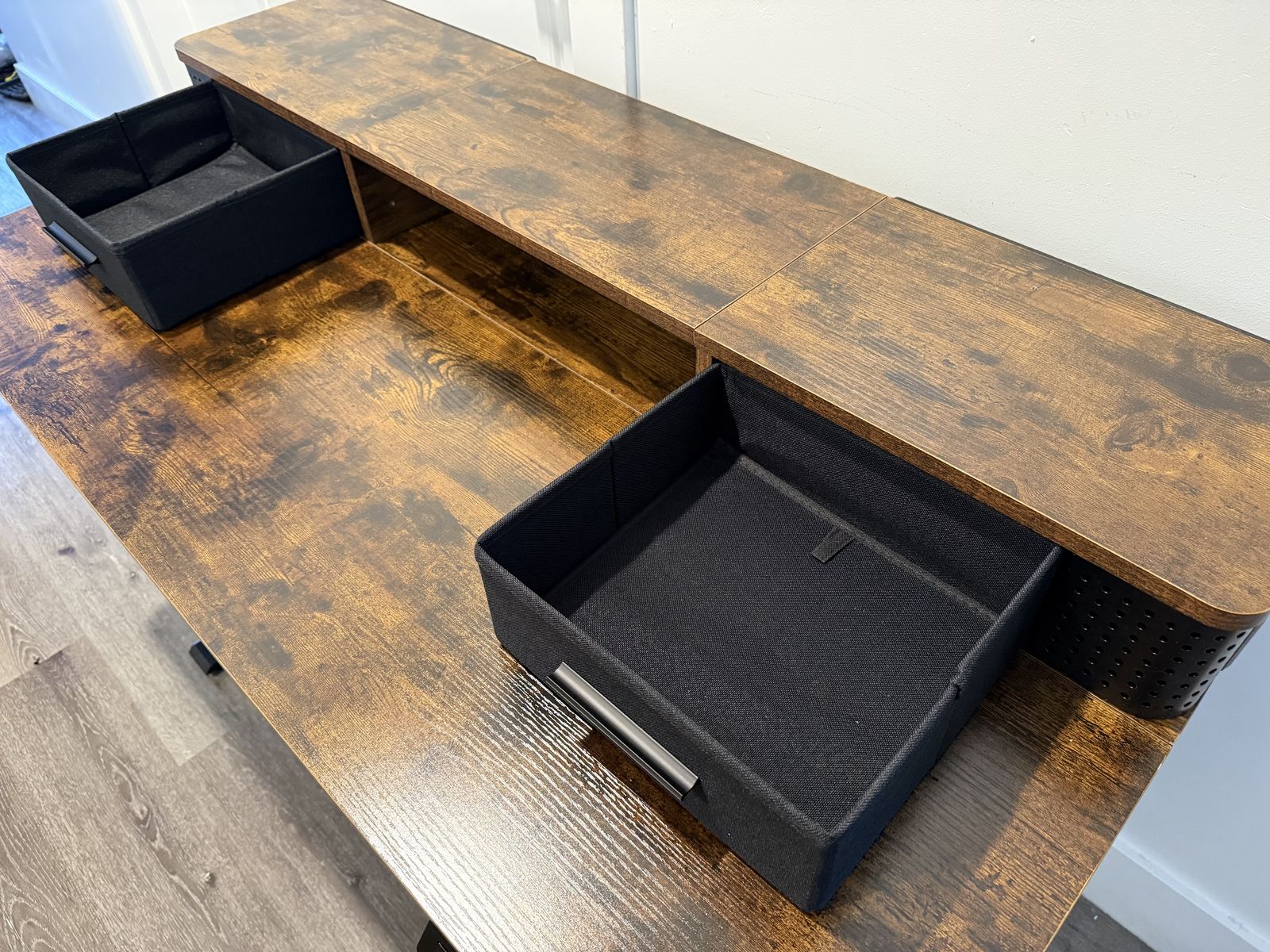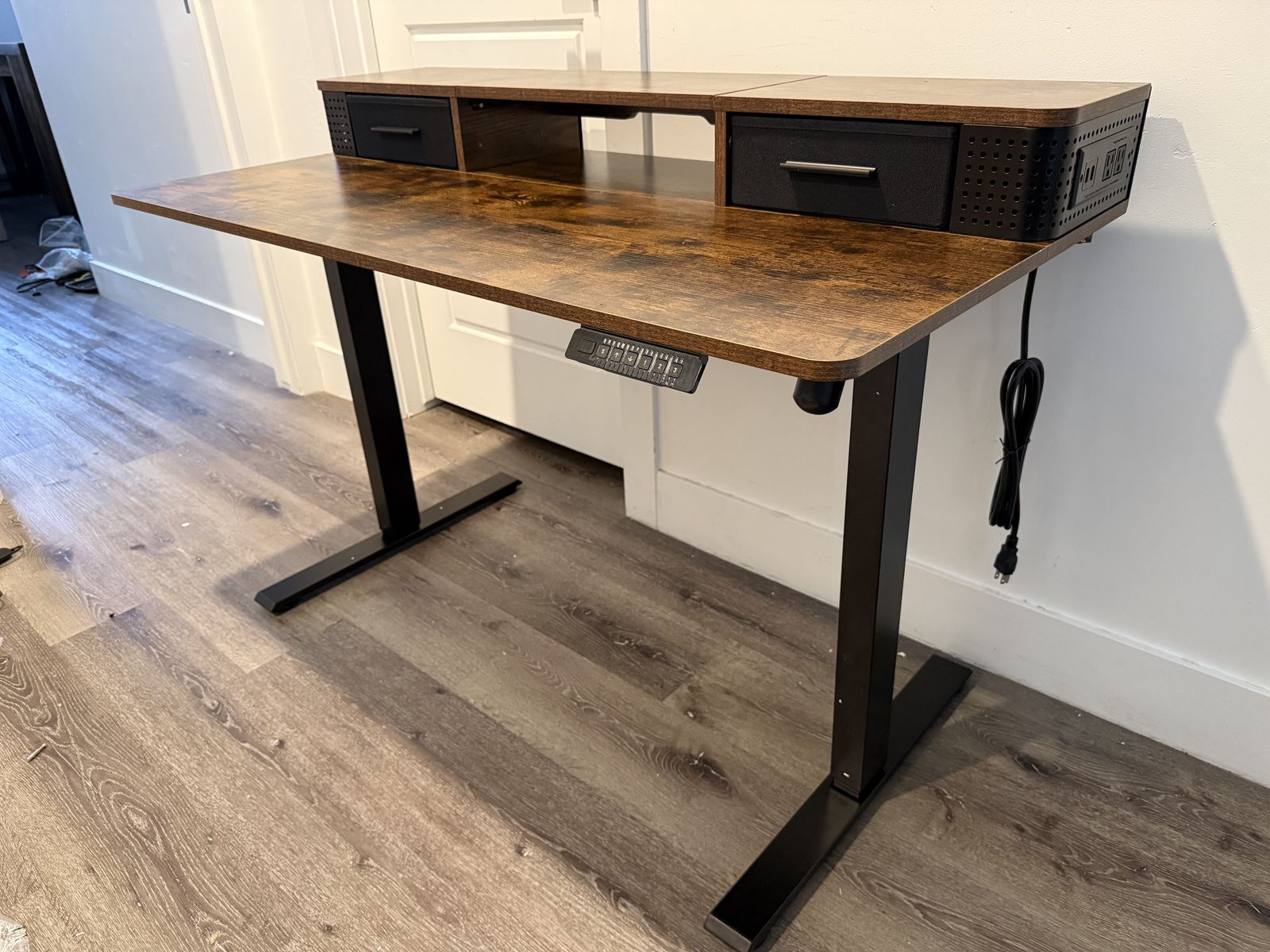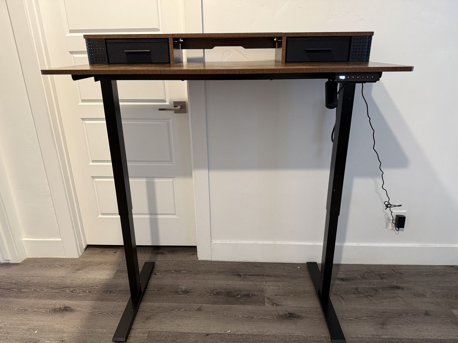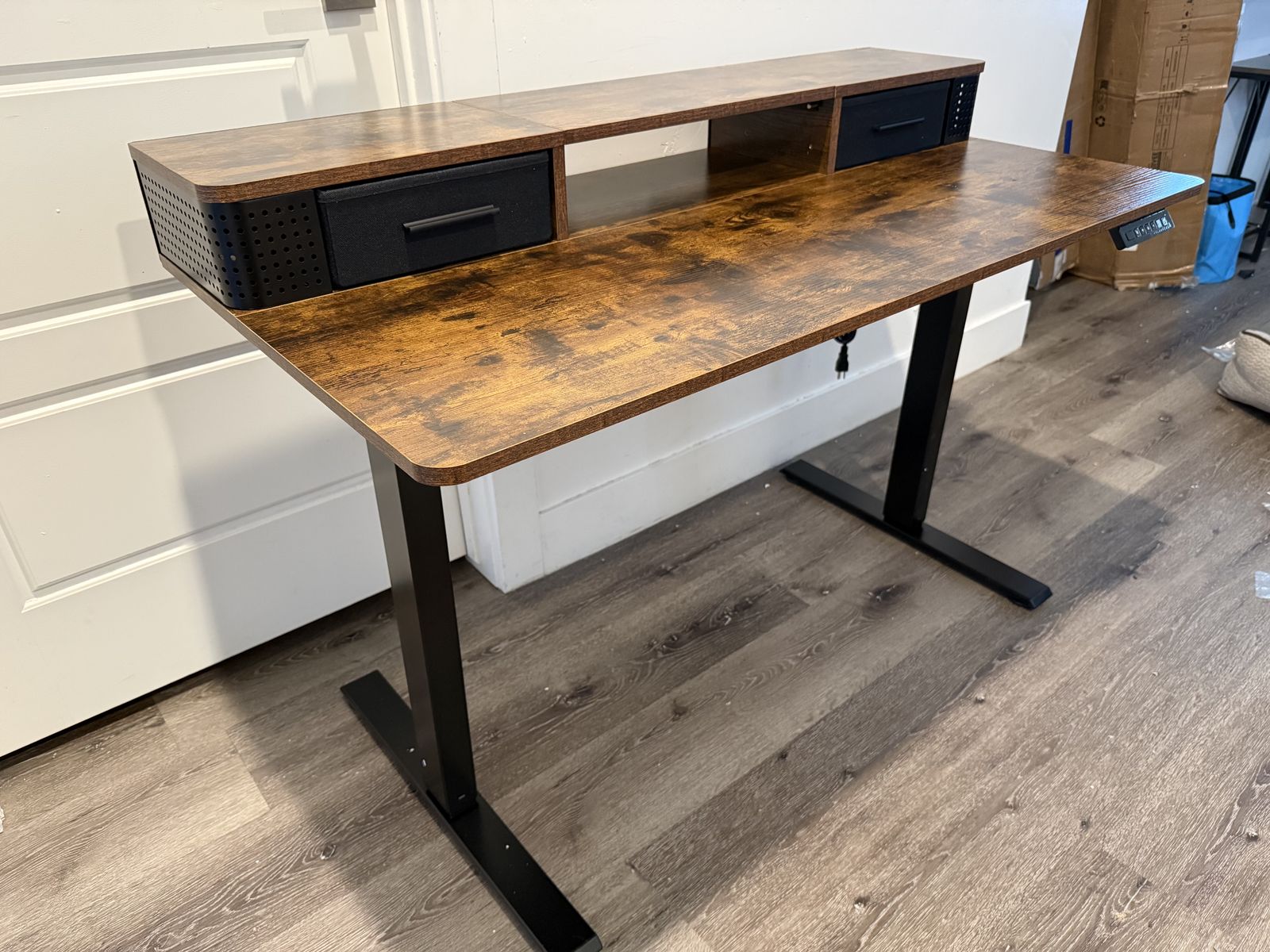 VenmoBrand New Electric Standing Desk with Drawers, 47.2 x 23.6 Inches, Sit Stand Desk with Power Outlets, Adjustable Height, Storage Shelf, 3 Memory Buttons, for Home Office, Rustic Brown