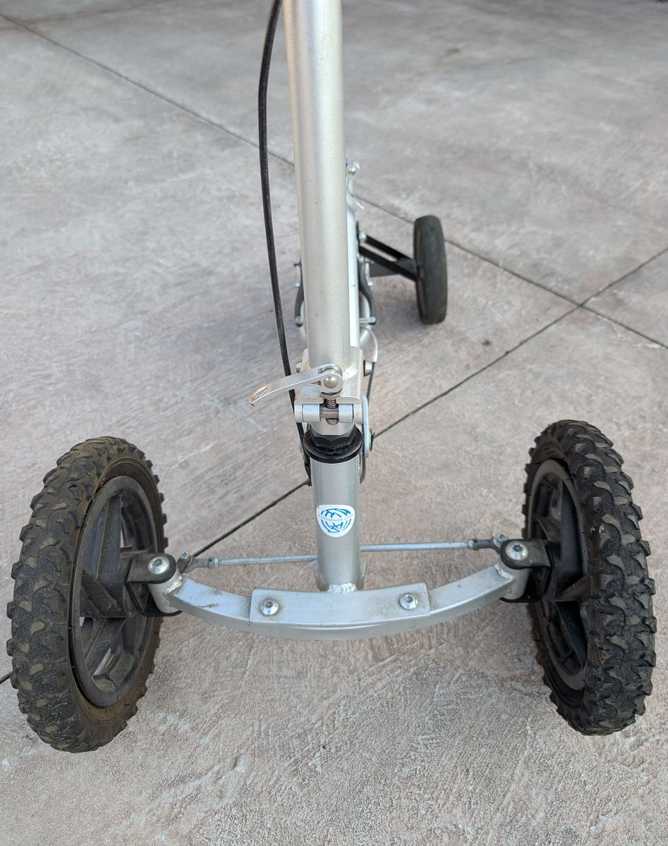 GooglePaySpecificationsColor: Metallic Silver Product Weight: 28.5 lbs Weight Capacity: 350 lbs Overall Length: 36" Handlebar Height Range: 33" to 44" Overall Height w/ handlebar folded and and seat removed: 19" Knee Support Height Range: 19" - 25" Knee pad: 7" wide x 12.5" length Front Axle Width: 20.5" Rear Bicycle Brakes
