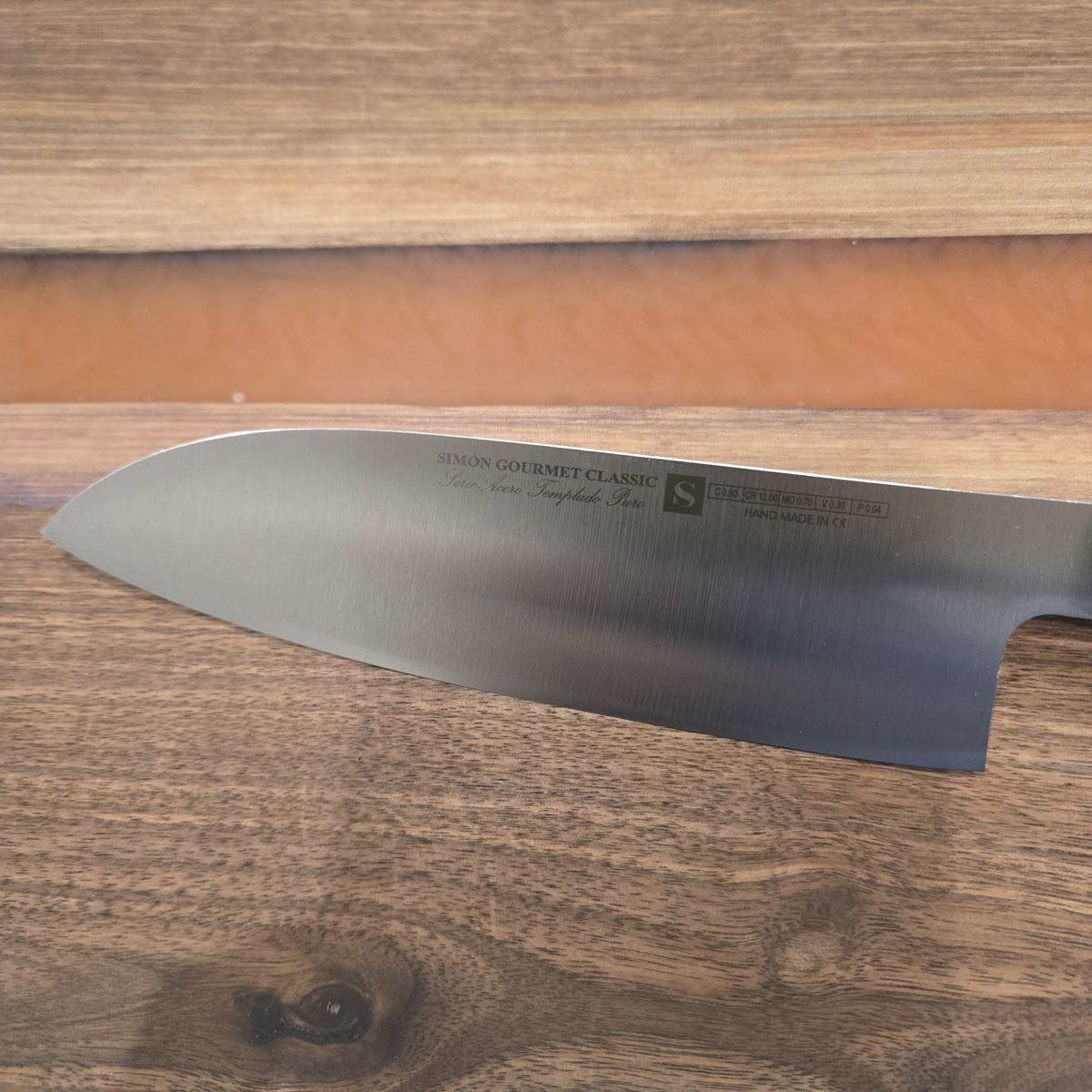 Asymmetric 18‑centimeter Santoku knife for meats, fish, and vegetables, with a lightweight black fiber handle and a one‑piece tempered steel construction. It is also ideal for slicing cold cuts and cheeses, and comes in a presentation blister pack.