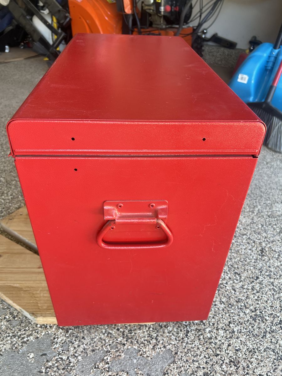 ZelleHomak locking toolbox measuring 26"x20"x13.5" in very good condition. It is heavy and not easily portable. I berlieve it is designed to fit on top of a rolling toll chest. Two keys are included. The top must be opened to open any of the drawers.