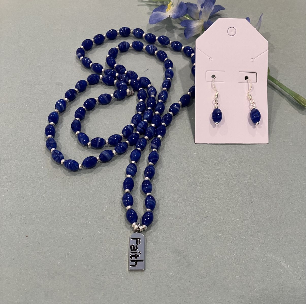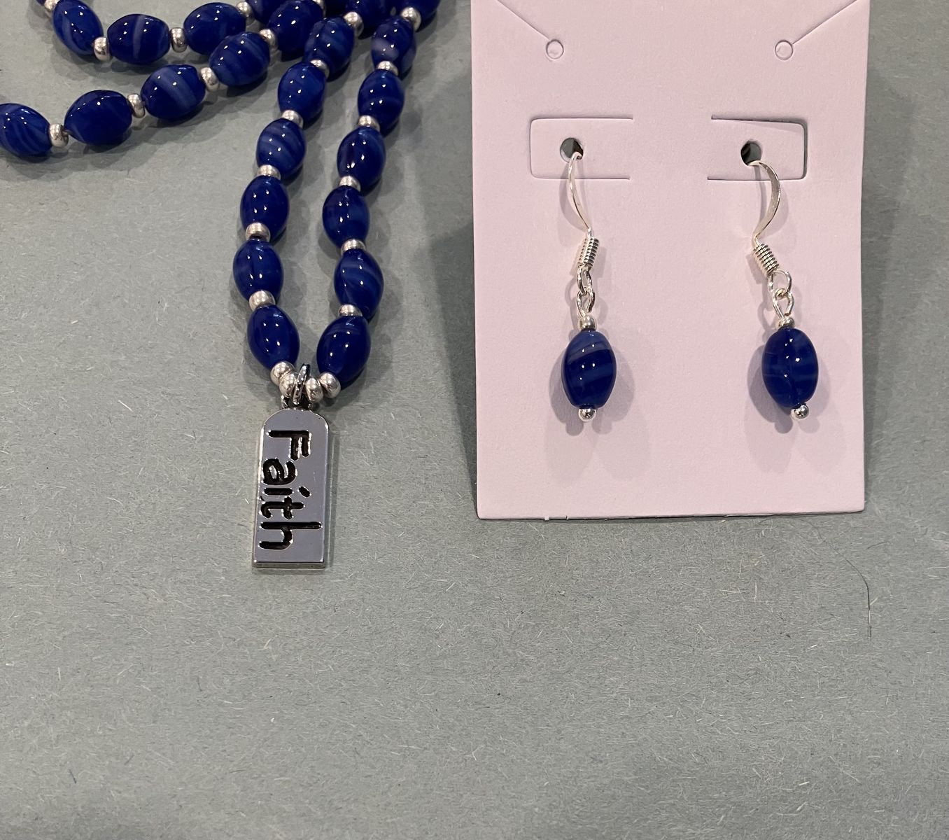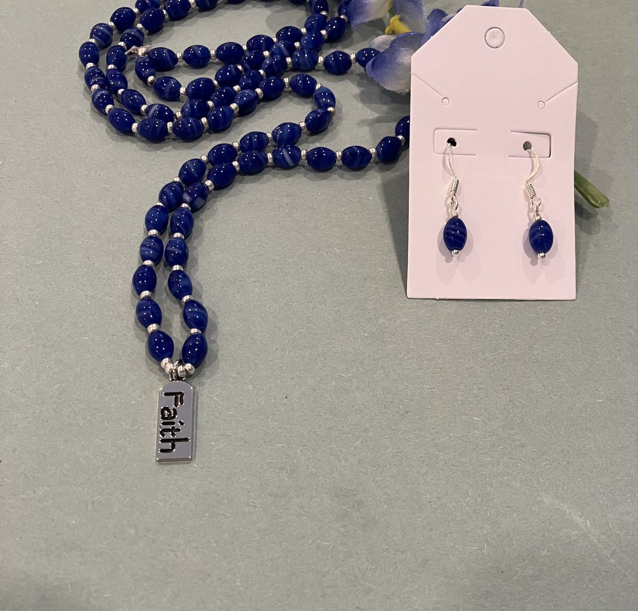 Venmo33 inch long, glass beaded royal blue and silver necklace with a silver "Faith" pendant and matching drop style, dainty earrings. Ear wires are silver plated. No need for a clasp due to the length of this necklace for easy, comfortable wear. Gift box included. Local meetup or can mail with ship fee.