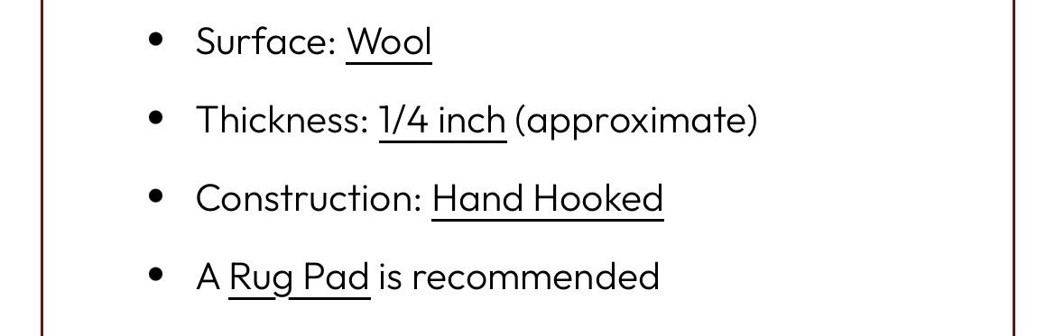 • Surface: Wool • Thickness: 1/4 inch (approximate) • Construction: Hand Hooked • A Rug Pad is recommended