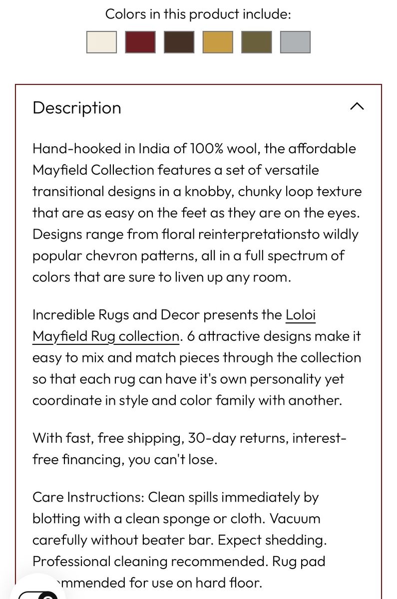 CashAppDimensions 7’10”x11’ Hand-hooked in India of 100% wool, the affordable Mayfield Collection features a set of versatile transitional designs in a knobby, chunky loop texture that are as easy on the feet as they are on the eyes.