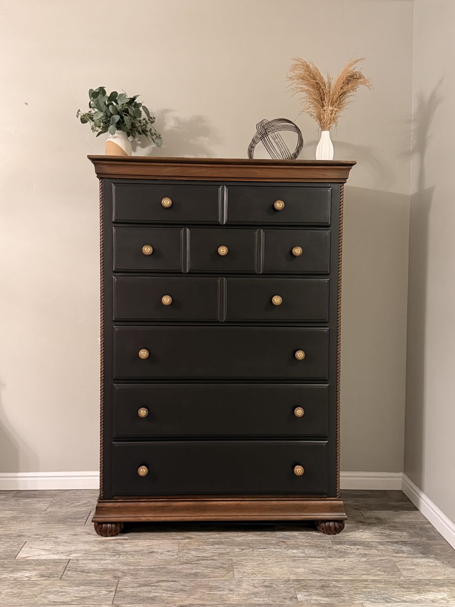 ApplePayBeautifully refinished tall boy dresser with a black satin solid wood base and Dark Walnut accents throughout the entire piece. The original wooden handles are stained to match with genuine brass inserts. If you have any questions please message me! Length: 60 inches Width: 19 inches Height: 42 inches