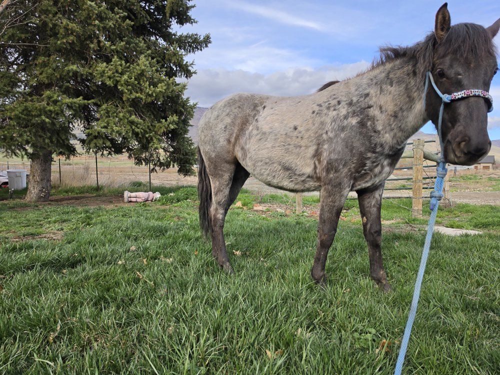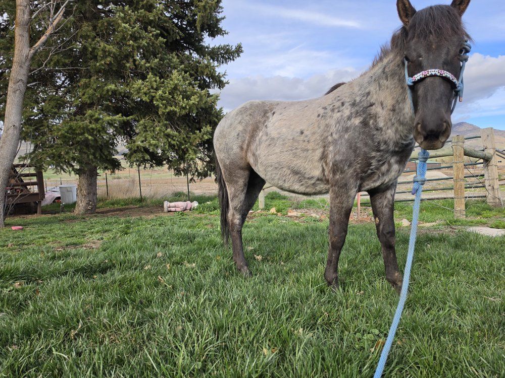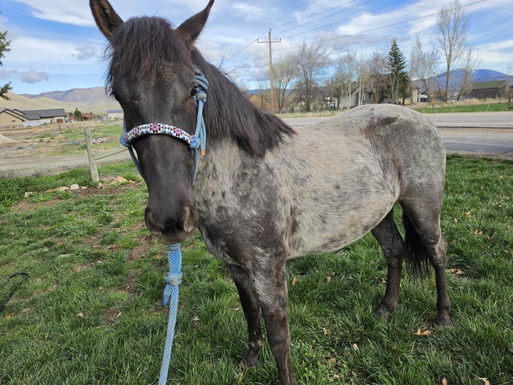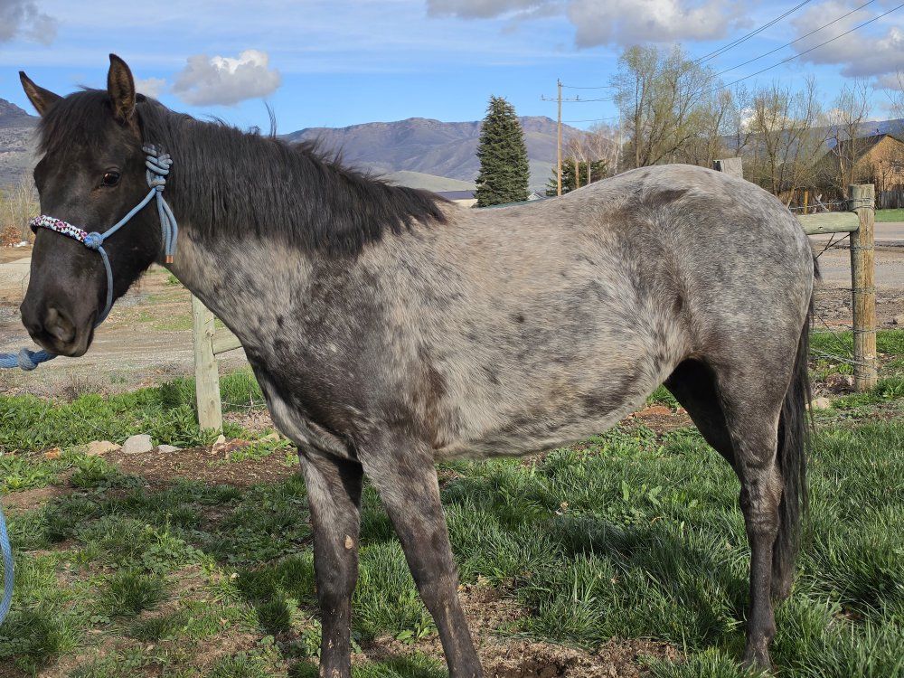 Grade little filly, will be two in the fall. Has started on basic groundwork. Is easy to catch in a smaller area but can be tricky in an open field, she stands tied and I can pick up all her feet, she has been trimmed 4-5 times. Loads in and out of a trailor and is good with dogs