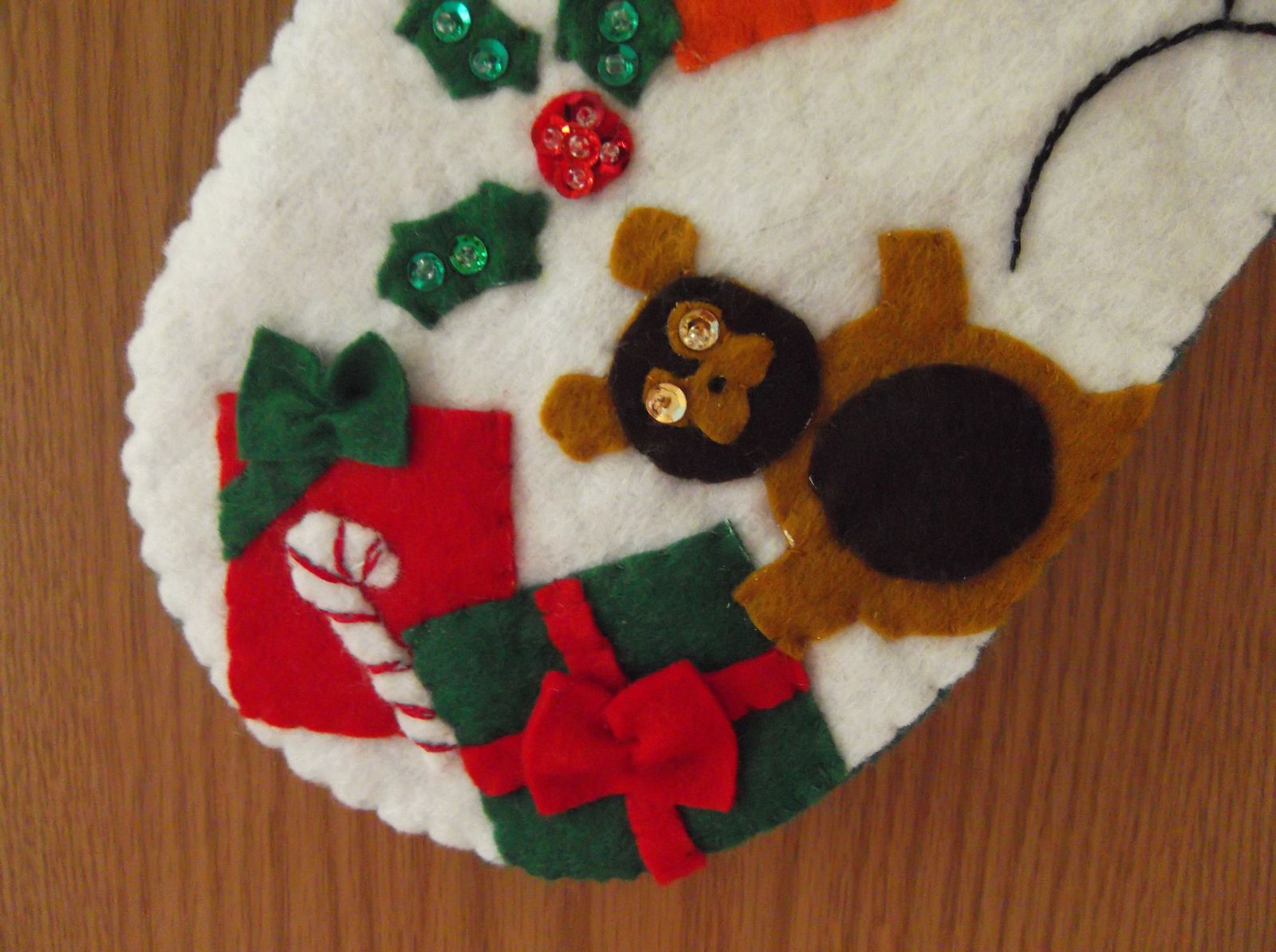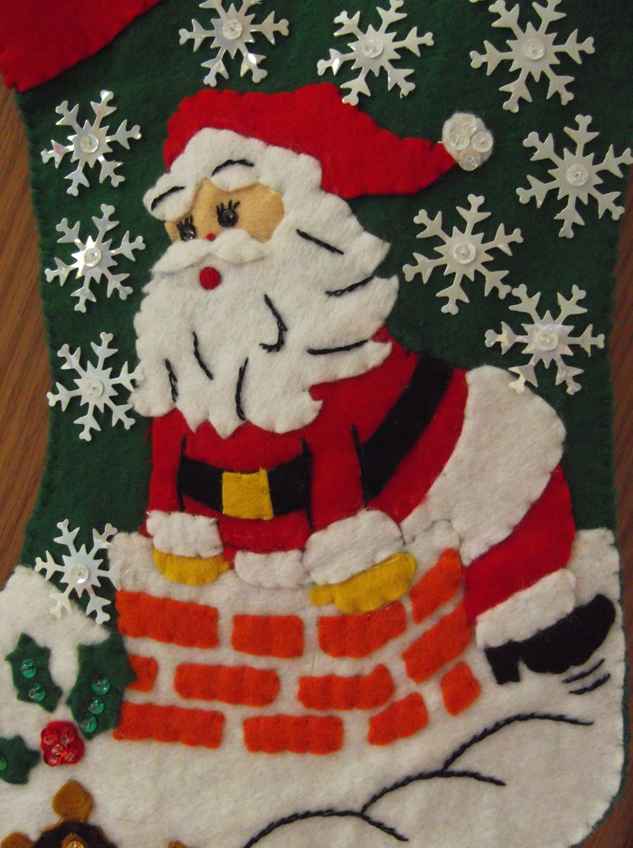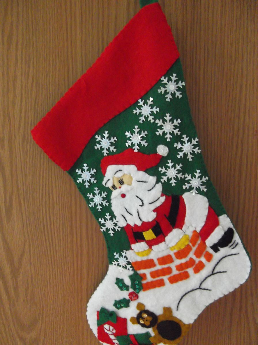 UP ON THE ROOFTOP REINDEER PAUSE, OUT JUMPS GOOD OLD SANTA CLAUSE! Do you remember that song? The stocking is a sequined felt stocking lovingly done by hand. It features Santa Claus getting ready to head down the chimney to deliver all the toys to the boys and girls. The stocking has a 17.5” diagonal measurement and an 8” opening. The green felt hanger is firmly attached so feel free to stuff it full of Christmas goodies.