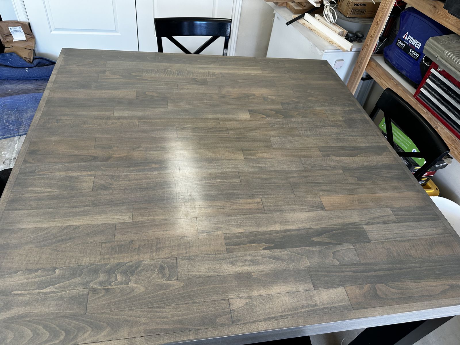 VenmoTop and legs are maple, chairs are from Rcwilley probably pine or some softwood. Some of the chairs have been repaired and repainted. The legs fold down to store. 10 years old has scratches and marks but overall good condition.