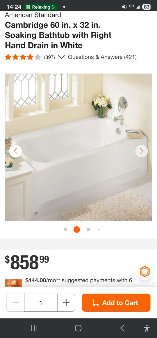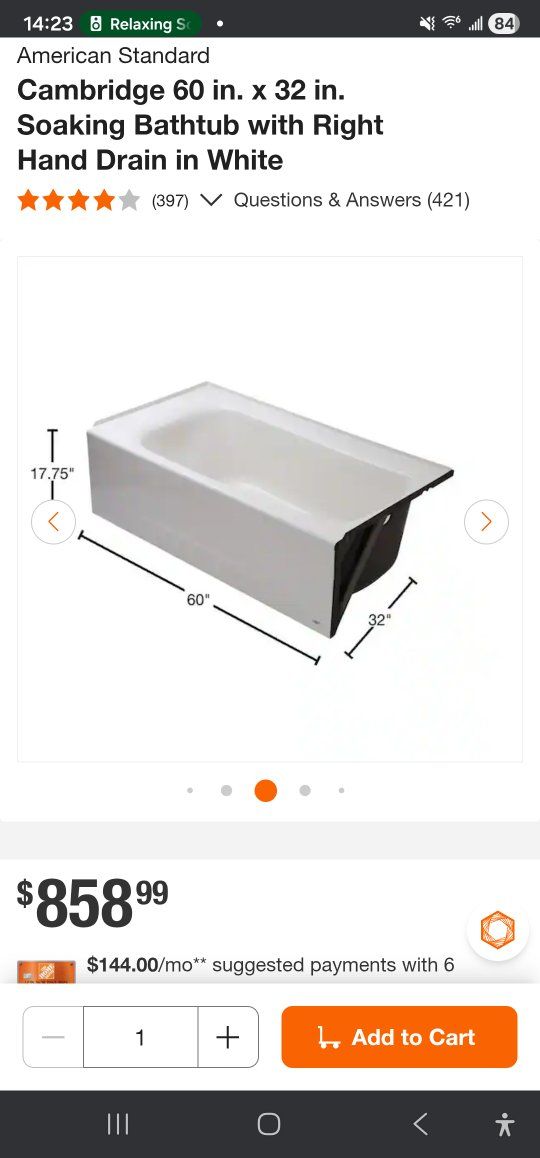 VenmoNEW American Standard Cambridge 60 in. x 32 in. Soaking Bathtub with Right Hand Drain in White This Bathtub is new and still in the box. From The Home Depot it costs $858.99.