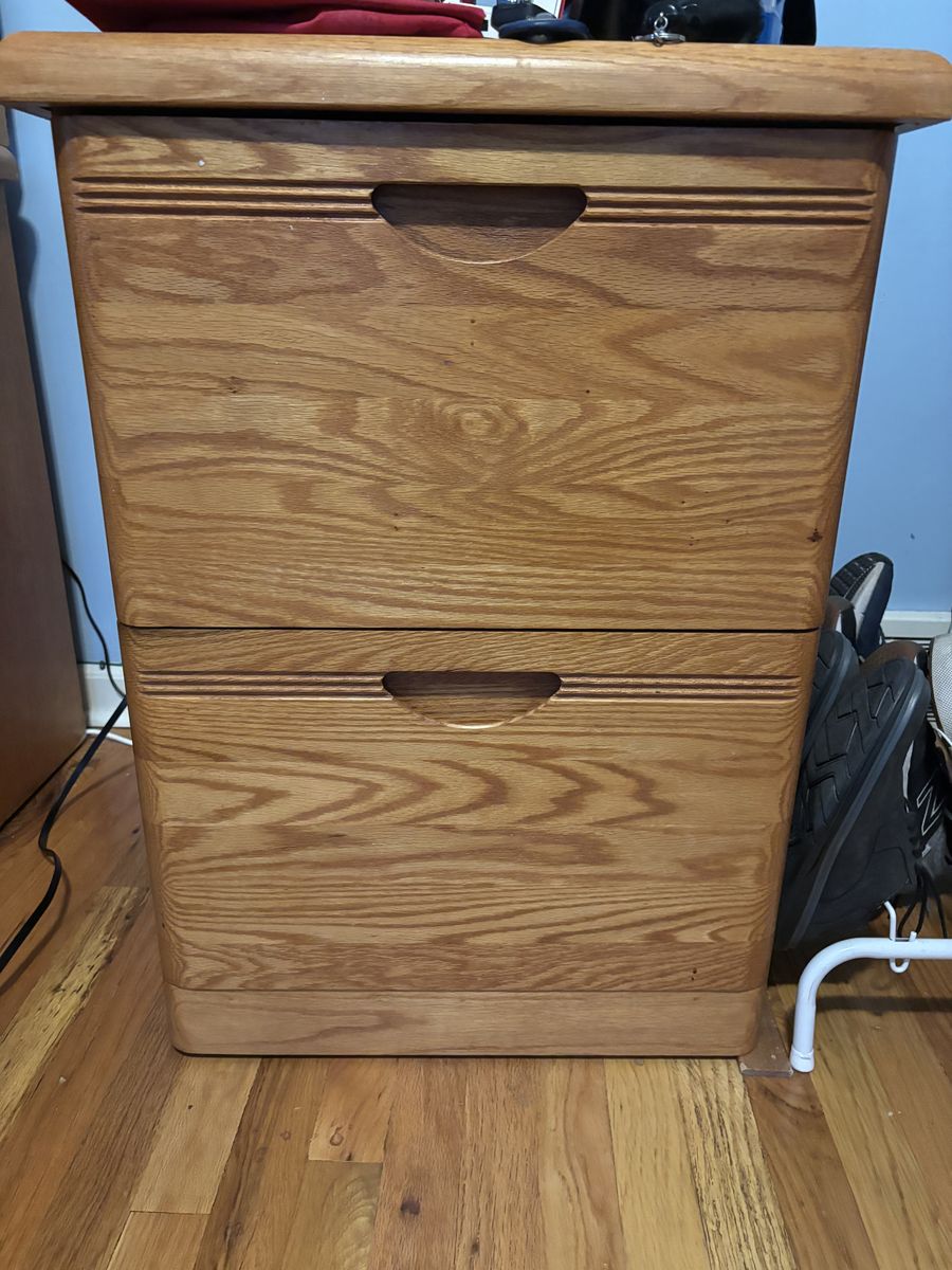 Solid wood desk with minimal wear and matching filing cabinet. Must be able to take it away by yourself.