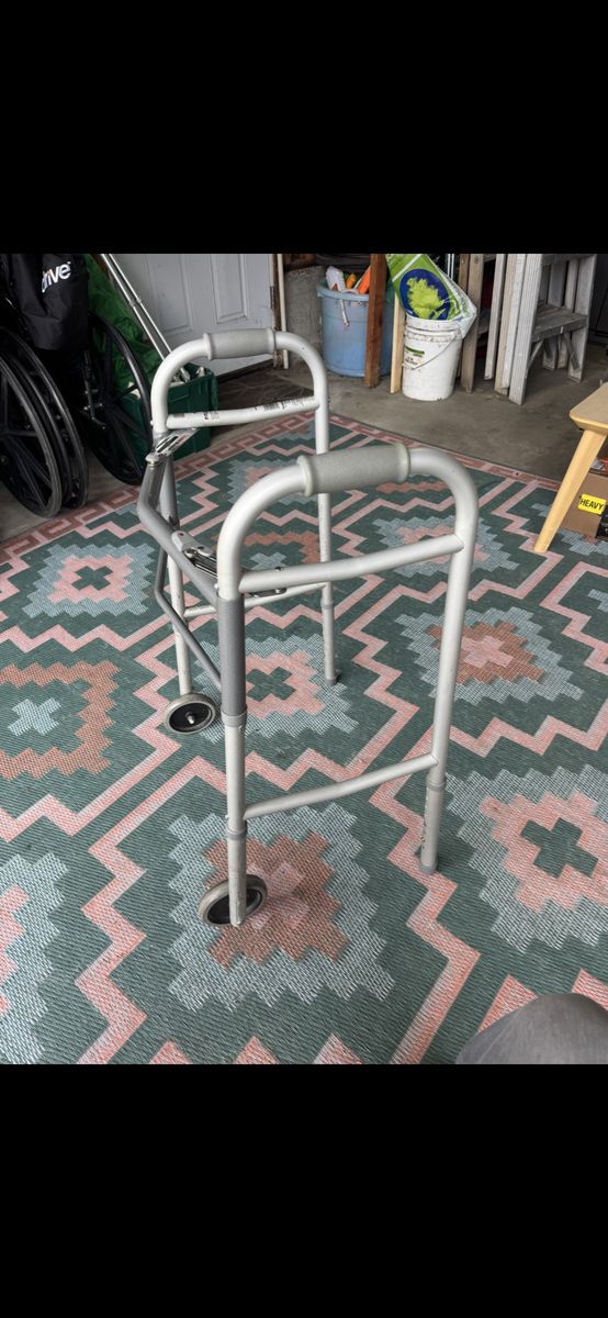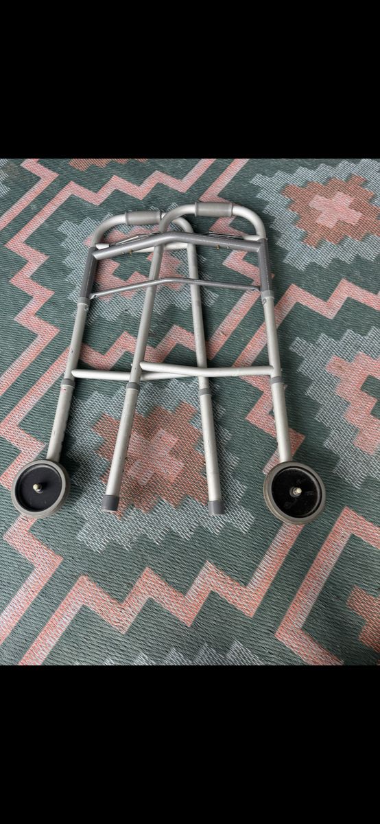 Has 2 Wheels, adjustable, and folds up out of the way. Works well