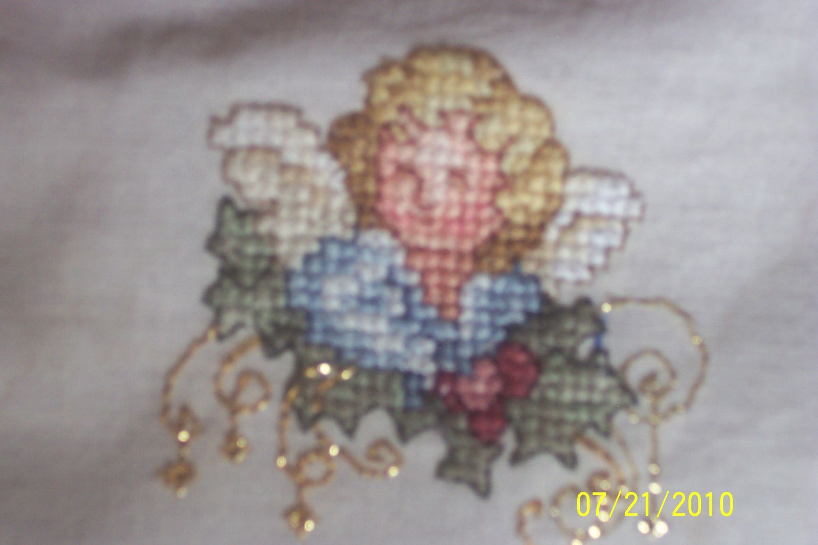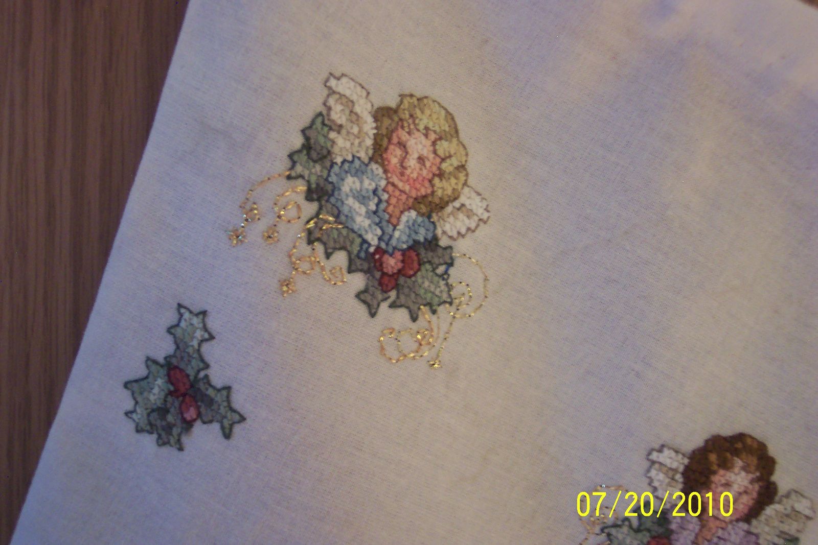 Stocking is lovingly cross-stitched, original design featuring six different Christmas Angels and Holly Leaves. The stocking is embellished with gold metallic thread. The stocking has a 17.5" diagonal measurement and a 7.5" opening and a maroon velveteen backing with a cream colored front. The hanger is braided red yarn that is firmly attached so feel free to stuff it full of Christmas goodies.