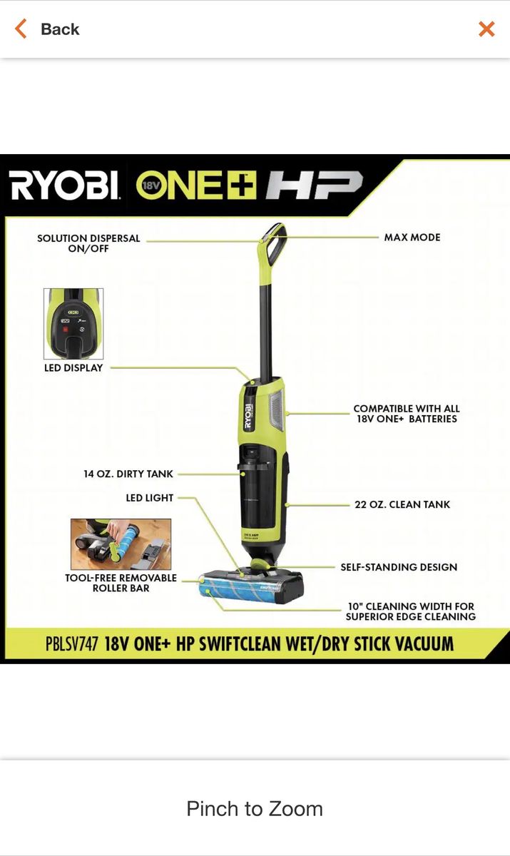 The RYOBI 18V ONE+ HP SWIFTClean Wet/Dry Stick Vacuum Kit combines mop and vacuum functionalities to dispense solution, clean your floors, and pick up debris with SWIFTClean Technology. Tackle both wet and dry messes with ease on sealed hard floors like hardwood, tile, stone, luxury vinyl plank (LVP), luxury vinyl tile (LVT) and other hard floors.