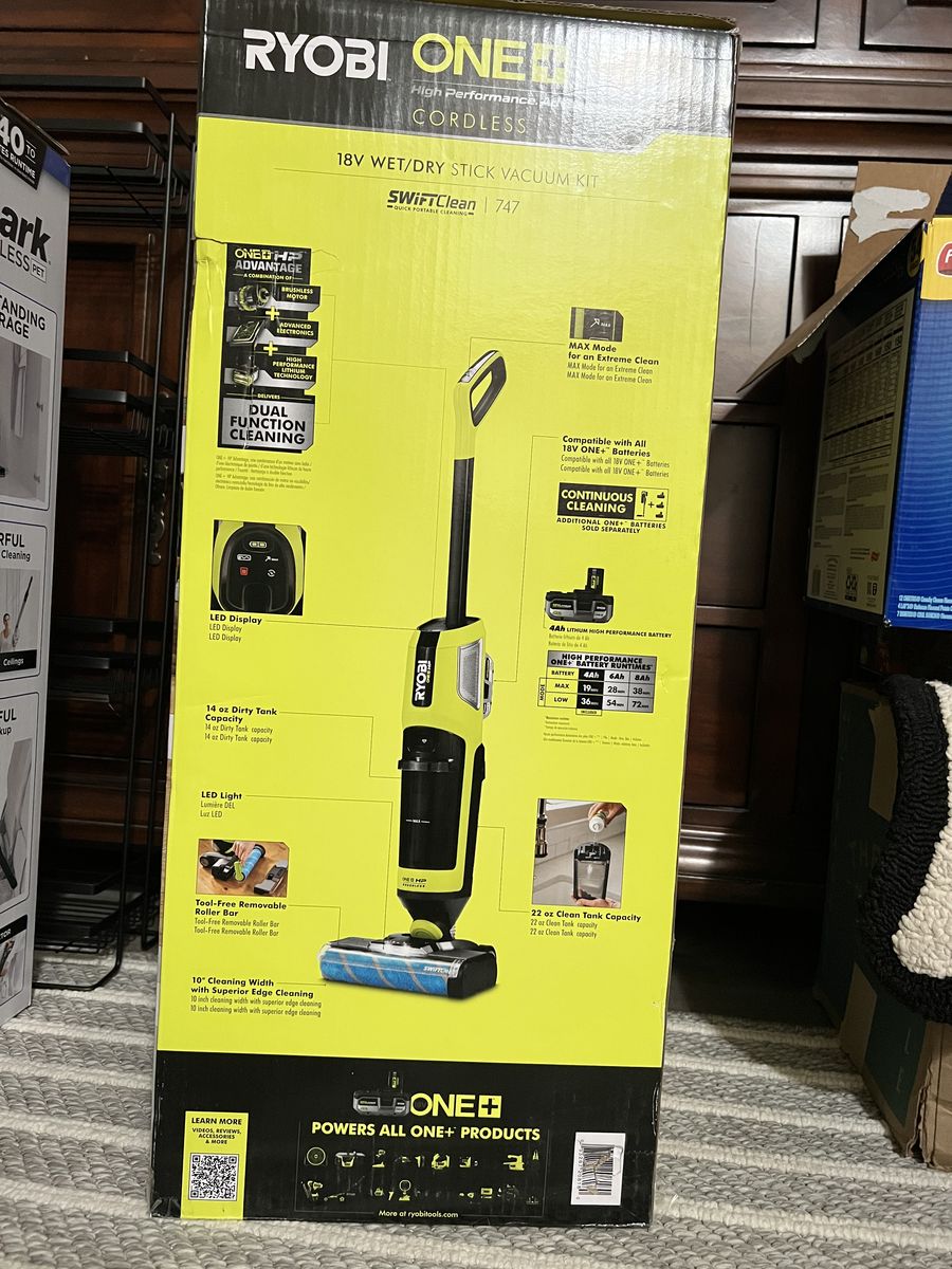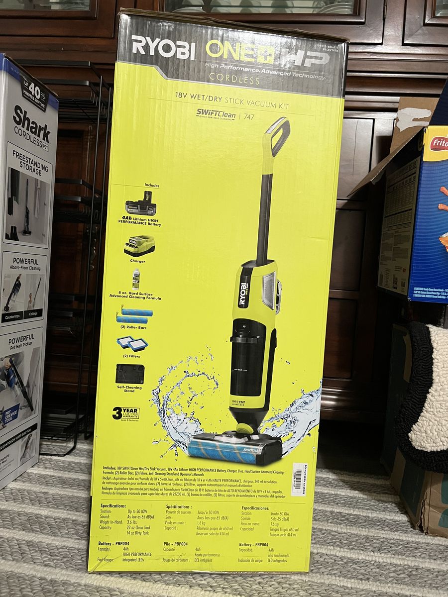 Includes: 18V SWIFTClean Wet/Dry Stick Vacuum, 18V 4Ah HIGH PERFORMANCE Lithium Battery, Charger, 8 oz. RYOBI Hard Surface Advanced Cleaning Formula, (2) Roller Bars, (2) Filters, Self-Cleaning Stand and Operator’s Manuals