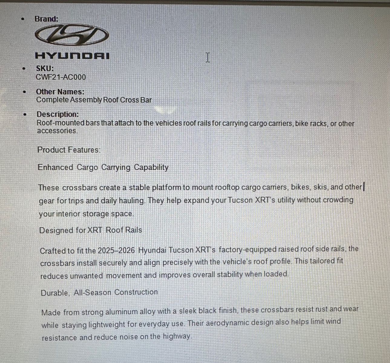 VenmoBlack Roof mount cross bar assembly for a 2025-2026 Hyundai Tucson. Received new still in box has never been opened.