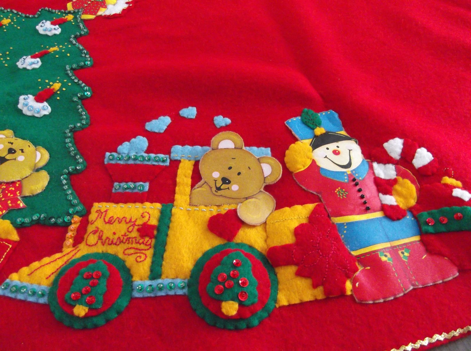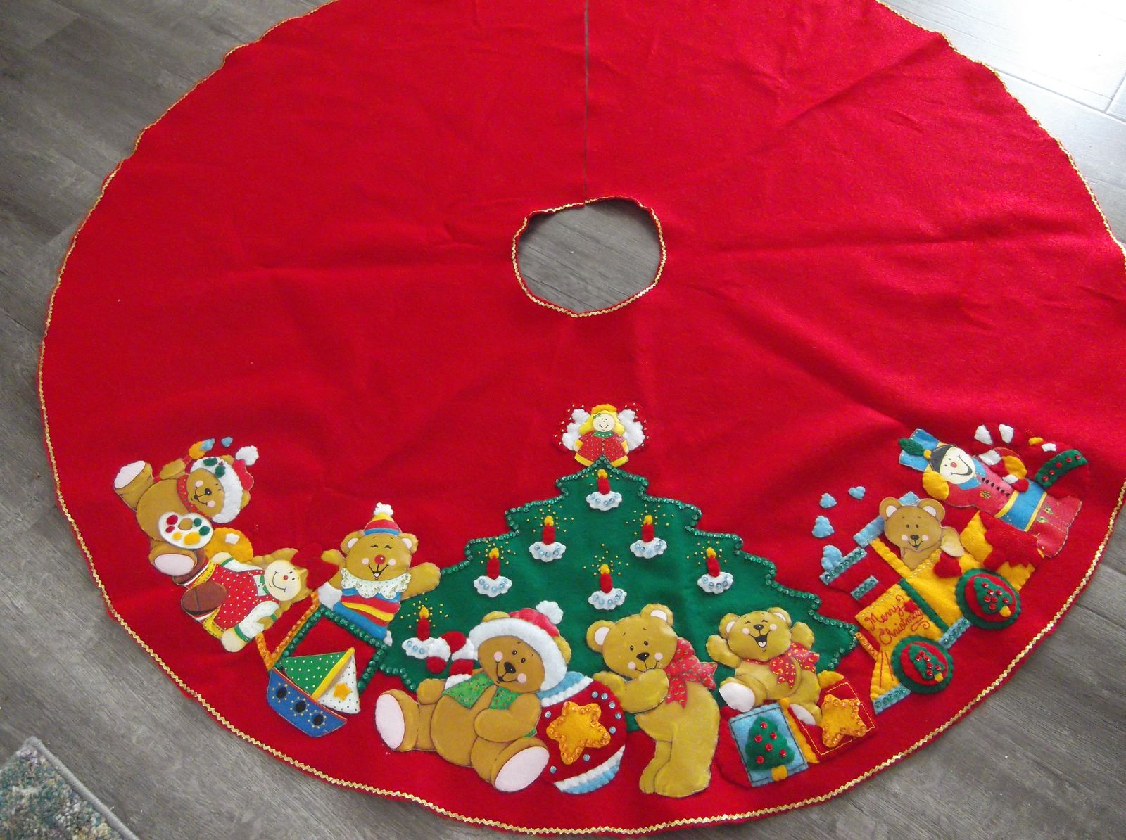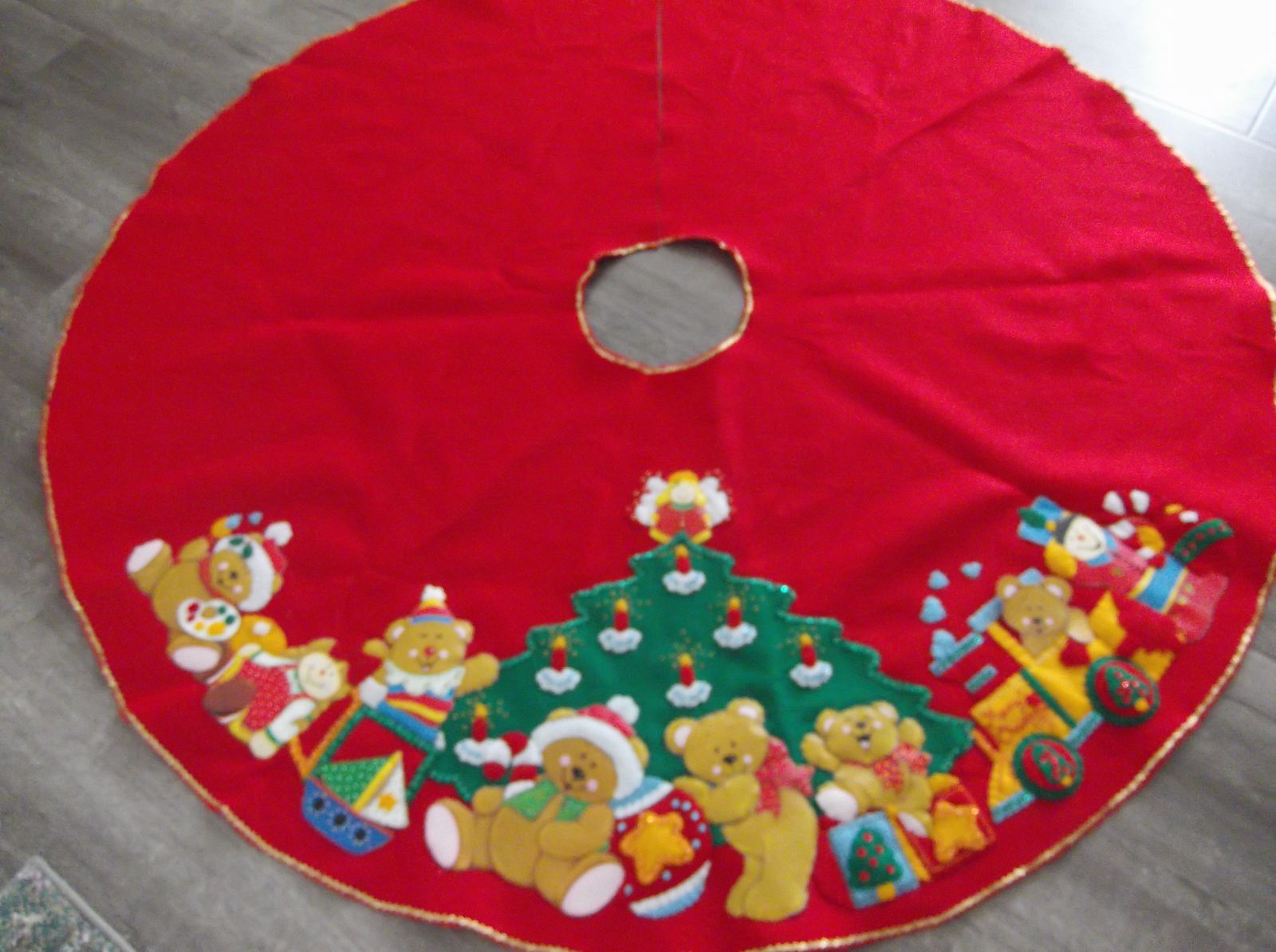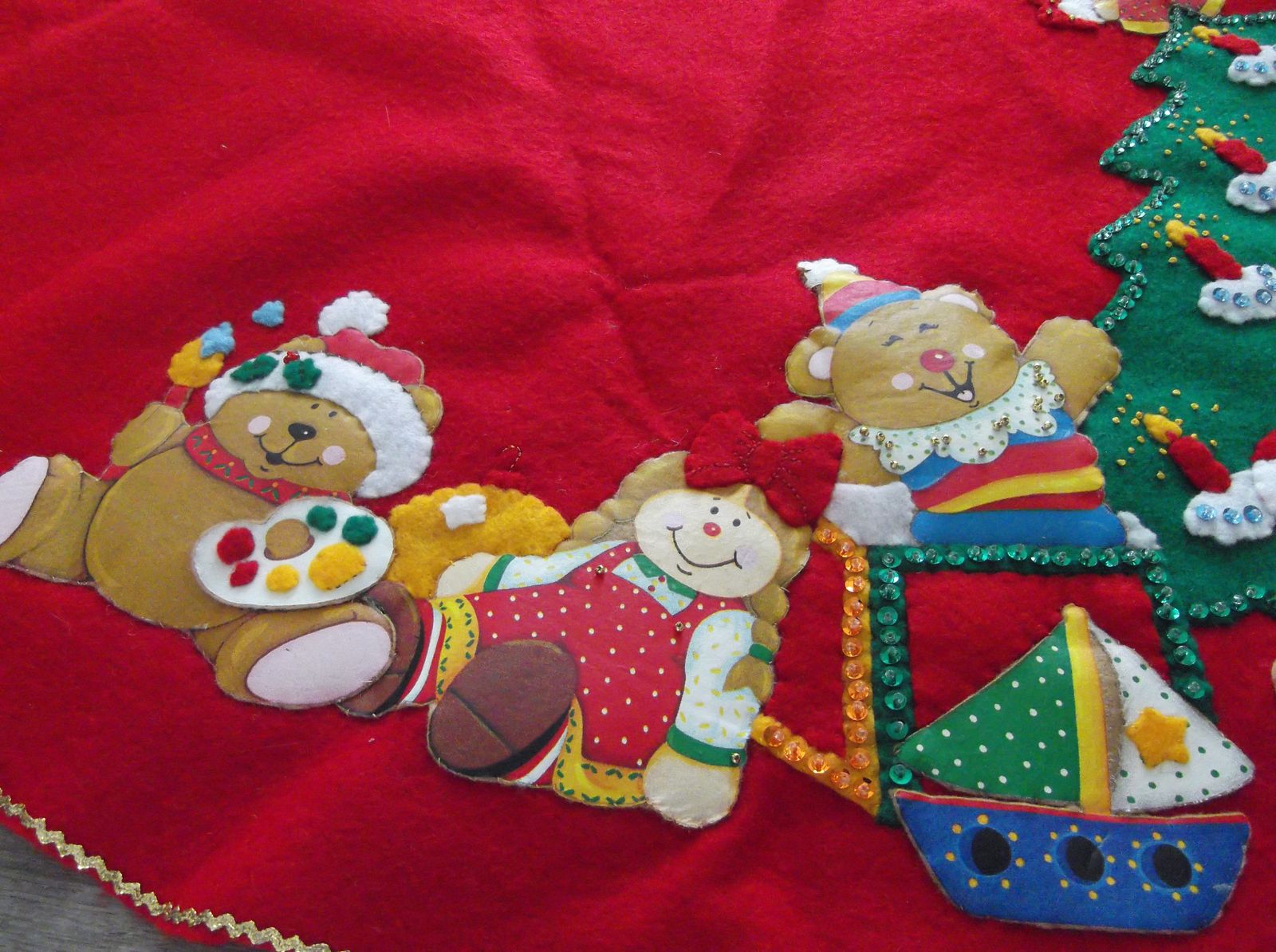 TEDDY BEARS LOVE CHRISTMAS TOO! The tree skirt is an embroidered and sequined felt tree skirt lovingly done by hand featuring iron on transferred teddy bears. It features six teddy bears and various toys around a large decorated Christmas tree. It measures 46.5” in diameter with a 6.5” center opening to wrap around your tree.