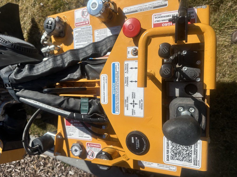 •Purchased in December 2022 at Global Machinery in Utah •Approx 50 hours •Power: 38 hp Kohler EFI gasoline engine •Weight: Approximately 1,500 lbs. •Dimensions: Overall •Length: 100.5 in. •Overall Width: 29 in. •Overall Height: 48 in. •Capacities: Fuel Tank: 7 gal •Hydraulic Tank: 7 gal •Cutting System: Cutter Wheel Diameter: UPGRADED Revolutionary 18 in. Wheel with 24 Cutting Teeth •Cutter Swing (width): 47 in. •Maximum Cutting Depth: 12 in. •Maximum Cutting Height: 22 in. •Undercarriage: Turf-friendly rubber track drive system